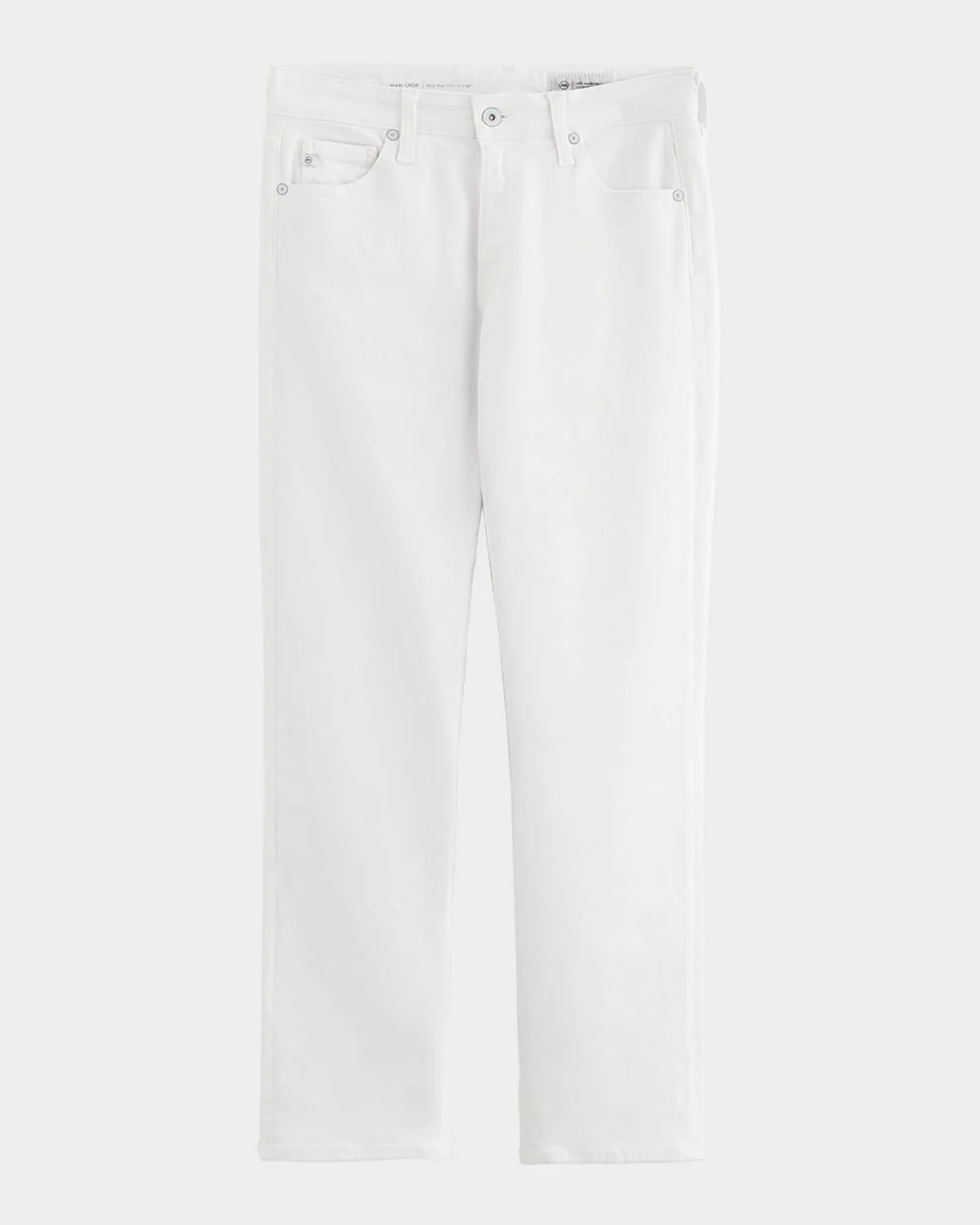 AG Jeans "Mari" straight-leg jeans in white stretch-denim & nbsp; Approx. 9.8" rise; 27" inseam Mid-rise; sits high on the hip Five-pocket style Slim fit Cropped length Button/zip fly; belt loops & nbsp; Cotton/polyester/elastane Imported