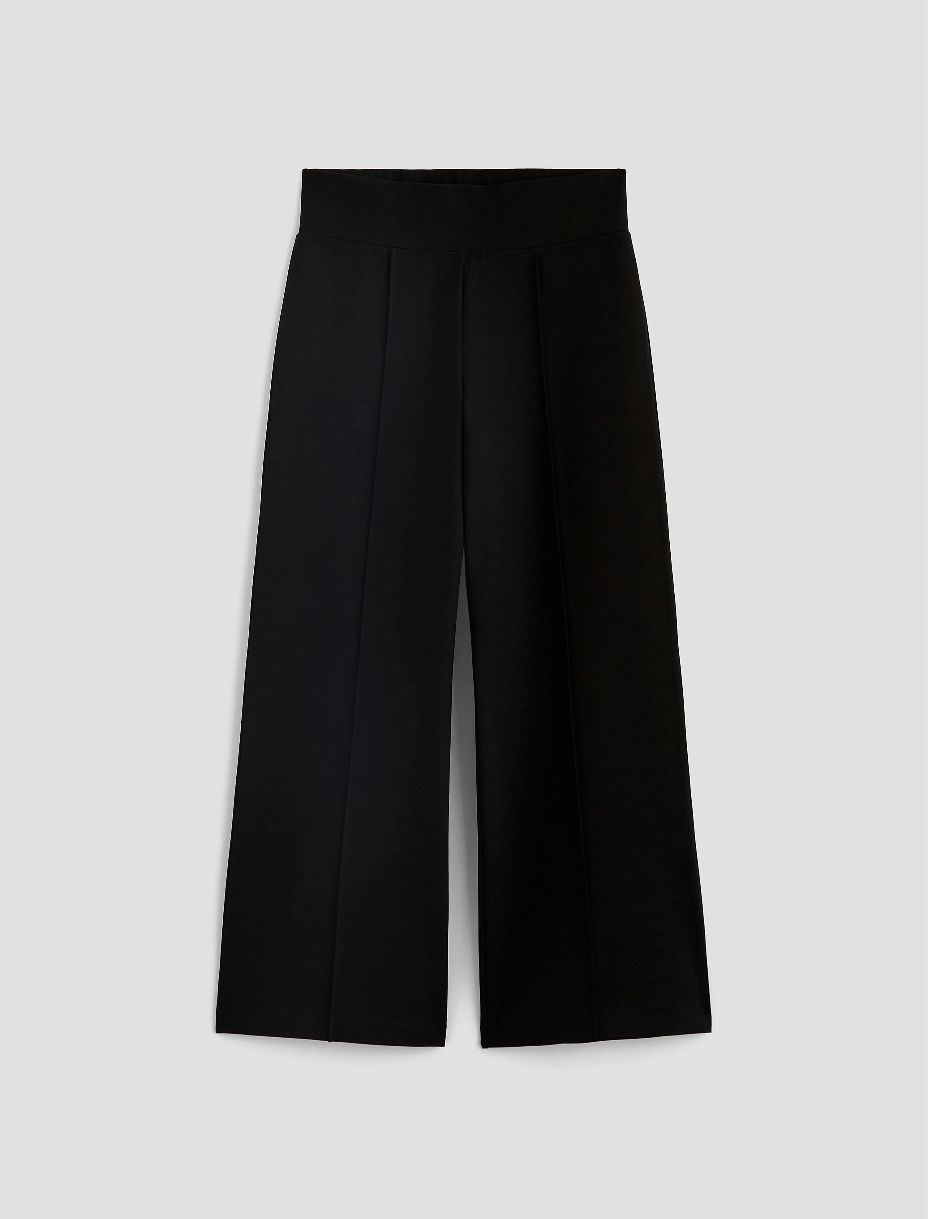 Pull On Wide Leg The Reagan pull-on pants have a high waist and a roomy wide-leg silhouette in soft stretch ponte. Flattering and comfortable, the pair features a classic black shade and pintuck detailing running down the front. DETAILS & FIT Model is wearing size S. - Front Rise: 10 3/4" - Knee Opening: 24" - Bottom Opening: 24" - Inseam: 30" FABRIC & CARE Soft Stretch Ponte, 60% Rayon, 35% Nylon, 5% Spandex