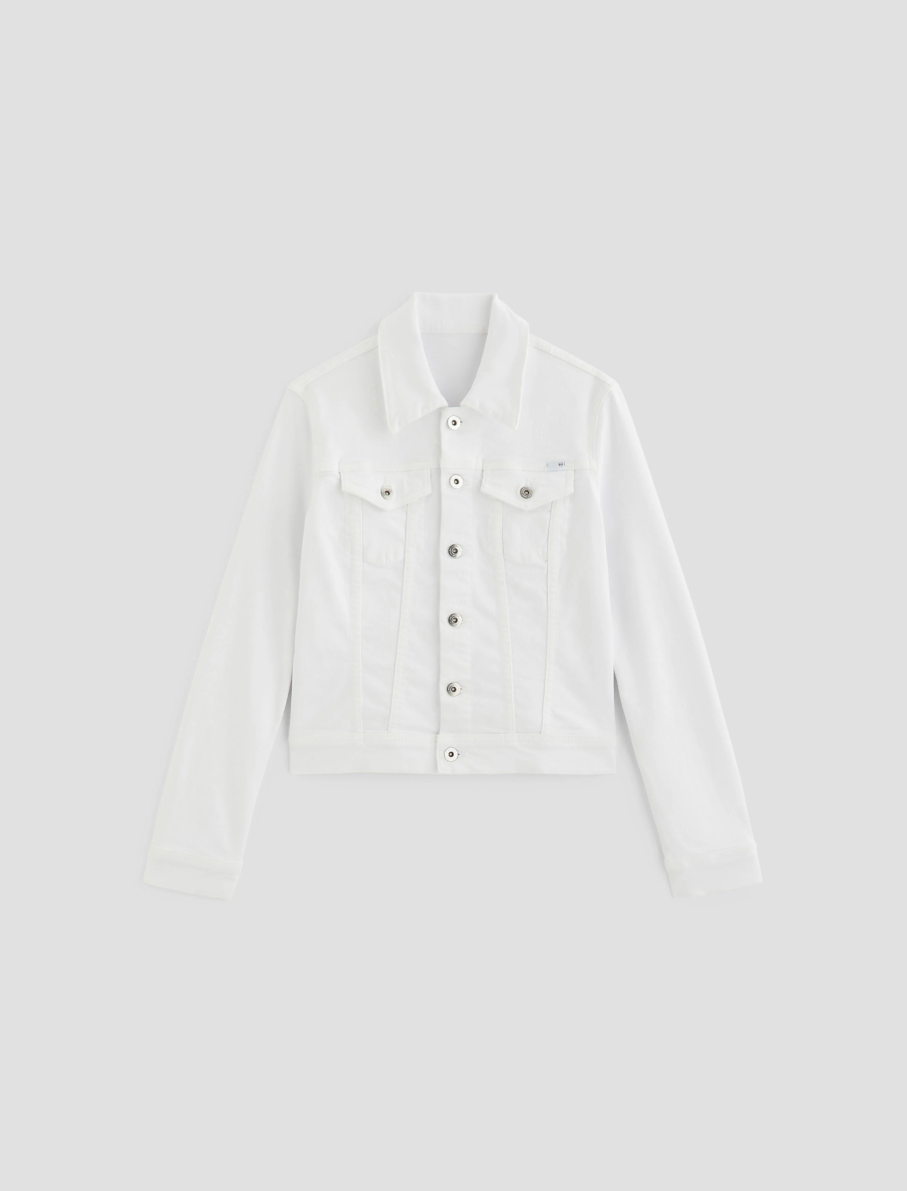 Slim Trucker The Robyn Jacket is a slim-cut jean jacket for women, done here in white. Fitted yet comfortable, this long-sleeve layering piece has an easy feel in 10.25 oz Cloud Soft Stretch Denim, an exclusive AG Cloud Soft Denim™ fabric that's designed to get more comfortable with every wear. Cloud Soft Stretch Denim, 10.25 oz. 93% Cotton, 5% Polyester, 2% Elastane DETAILS & FIT Model is wearing size S. - Body Length: 18" - Chest Width: 35" - Sleeve Length: 24" FABRIC & CARE Cloud Soft Stretch Denim, 10.25 oz. 93% Cotton, 5% Polyester, 2% Elastane