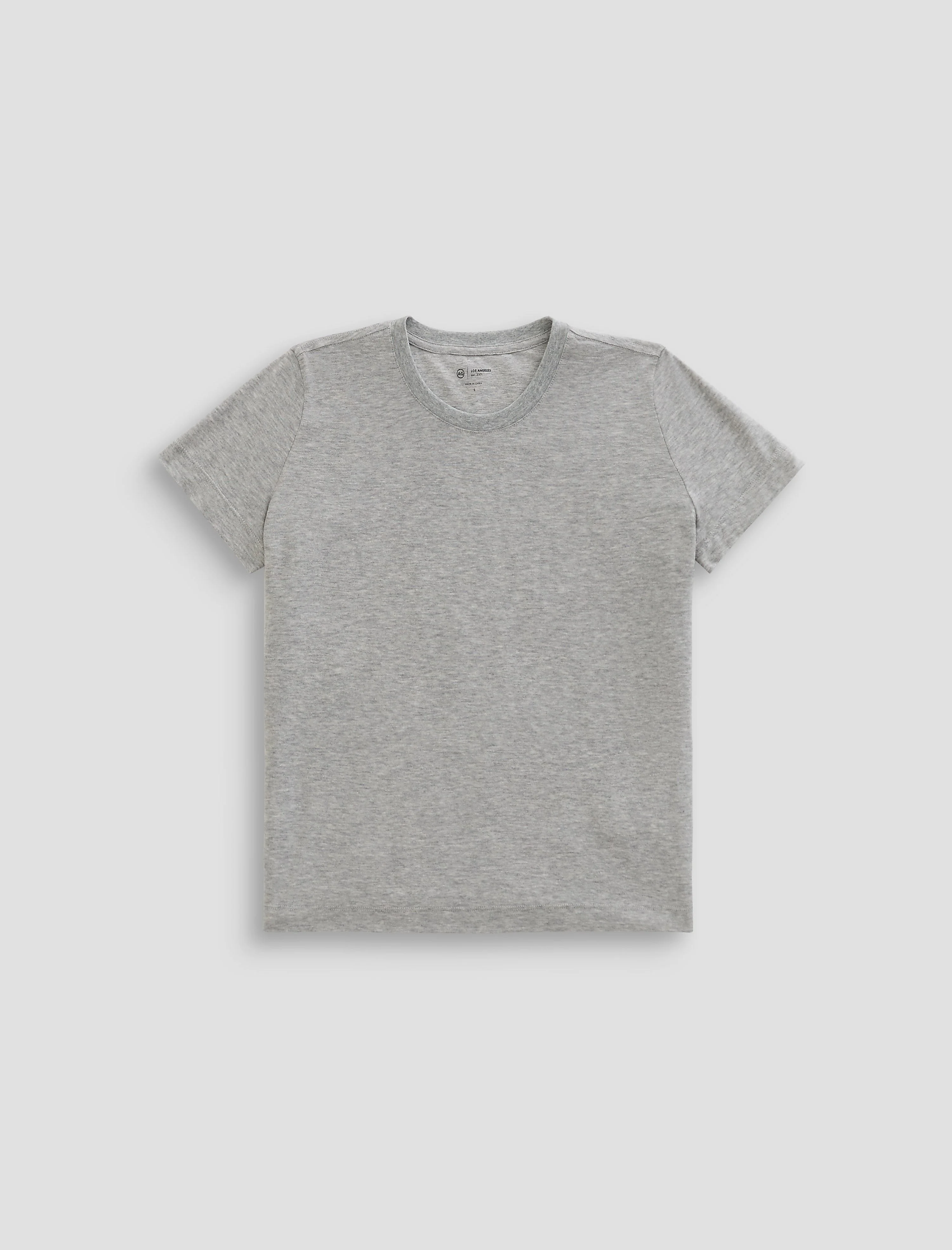 Relaxed Top Zoie has everything you'd want in an everyday tee. Knitted from our cotton blend Dream Slub Jersey fabric, this T-shirt features a soft handfeel and textured construction for a minimal yet elevated aesthetic. Designed with a high-hip length in a classic, slightly speckled grey color, Heather Grey. DETAILS & FIT Model is wearing size S. - Body Length: 22 1/2" - Sleeve Length: 5 3/4" - Chest Width: 37" FABRIC & CARE Dream Slub Jersey, 51% Cotton, 21% Tencel, 21% Modal, 7% Linen