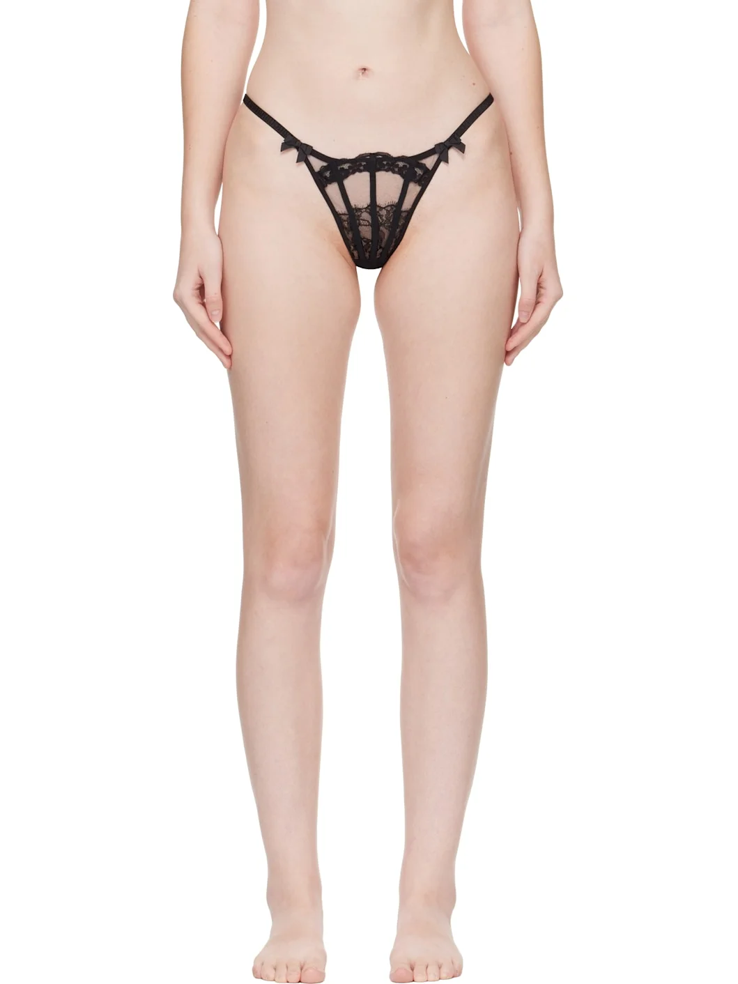 Sheer nylon tulle thong. · Lace trim throughout · Bow accents at elasticized waistband · Partial cotton jersey lining Supplier color: Black Body 1: 100% polyamide. Body 2: 76% polyamide, 24% viscose. Lining: 100% cotton. Made in Morocco 252281F081000