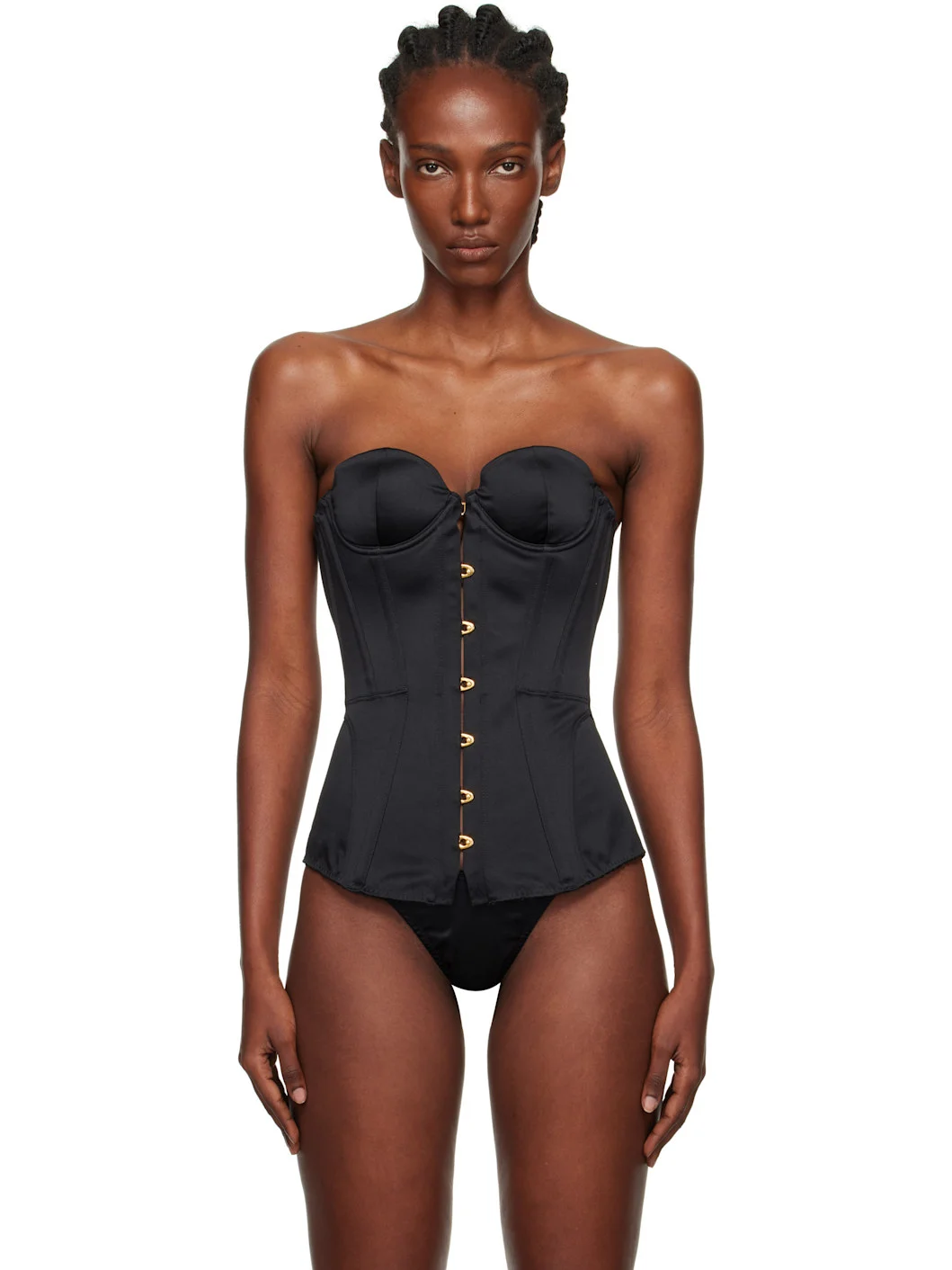 Satin corset. Boning throughout. · Sweetheart neck · Hook-eye closure · Underwire at padded cups · Scalloped edge at curved hem · Adjustable and detachable garter straps · Lace-up fastening at back · Full jersey lining Supplier color: Black Body: 100% polyester. Trim 1: 100% cotton. Trim 2: 100% polyester. Lining: 100% polyester. Made in Morocco 252281F368002