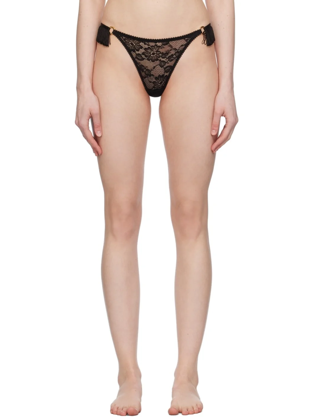 Sheer stretch nylon lace thong. Elasticized picot trim throughout. · O-rings and fringed detailing at waistband · Partial cotton jersey lining Supplier color: Black Body: 83% polyamide, 17% elastane. Lining: 100% cotton. Made in Morocco 241281F081016