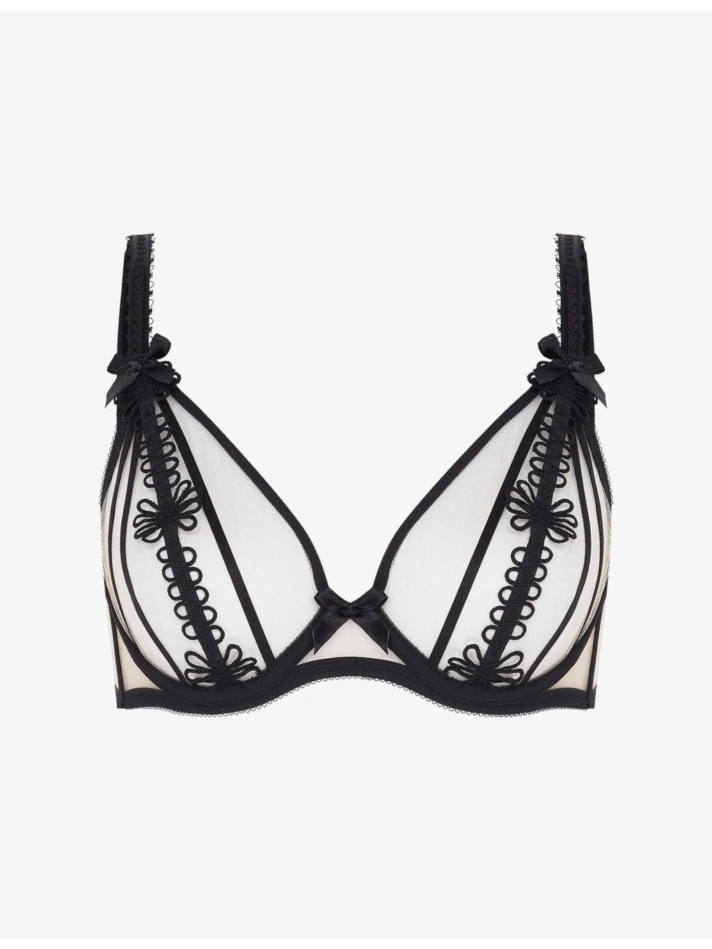 PRODUCT DETAILS - Agent Provocateur tulle bra - 100% polyamide; side panel lining 100% polyamide; lace webbing base: 67% polyamide, 33% elastane; crochet 100% polyester; elastic band 89% polyamide 11% elastane; bow 100% polyester - Hook-and-eye fastening - Plunge neck, underwired, sheer tulle, adjustable straps, ribbon strapping, embroidered floral swirls, silk-covered wire and bone casing, satin bows - Hand wash cold - True to size - Lightweight, slight stretch Ref: R04569209