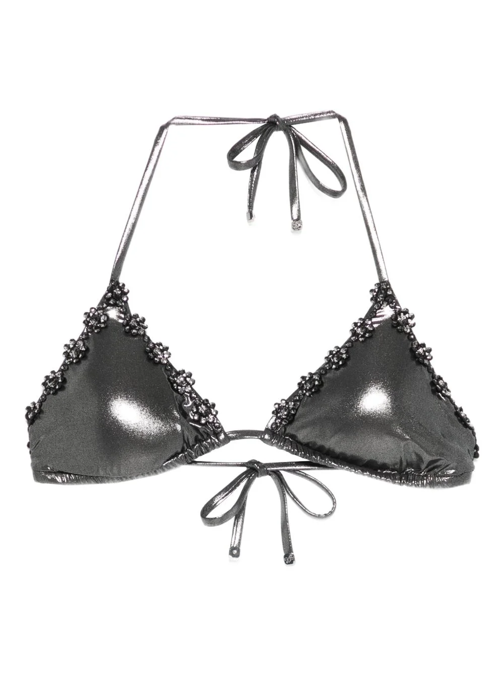 flower-embellished bikini top Highlights - Black - Metallic finish - Flower embellishment - Triangle shape - Tie fastening - Be mindful to try on swimwear over your own garments. Imported Composition Outer: Polyester 83%, Elastane 17% Lining: Polyamide 84%, Elastane 16% Washing instructions Read Manufacturer Guidelines