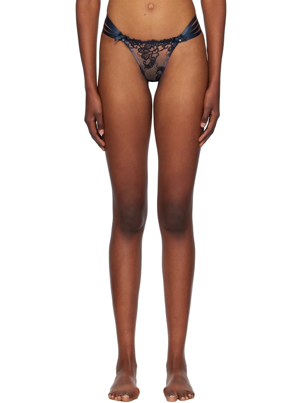 Sheer nylon mesh and guipure lace thong. · Swarovski crystals and bow accents at front · Elasticized straps at waistband · Criss-crossing detailing at back · Partial stretch silk satin lining Supplier color: Navy Body: 100% polyamide. Trim 1: 100% polyester. Trim 2: 91% polyamide, 9% elastane. Lining: 90% silk, 10% elastane. Made in Morocco 242281F081007