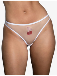 PRODUCT DETAILS - Agent Provocateur tulle tanga briefs - 100% polyamide; gusset lining 100% cotton - Tanga shape, low-rise, elasticated waistband, double side straps, cherry motif at front, picot trims, sheer tulle, medium coverage at back - Hand wash cold - True to size - Lightweight, slight stretch - For hygiene reasons, we are unable to exchange or refund this product, unless faulty. Ref: R04569214
