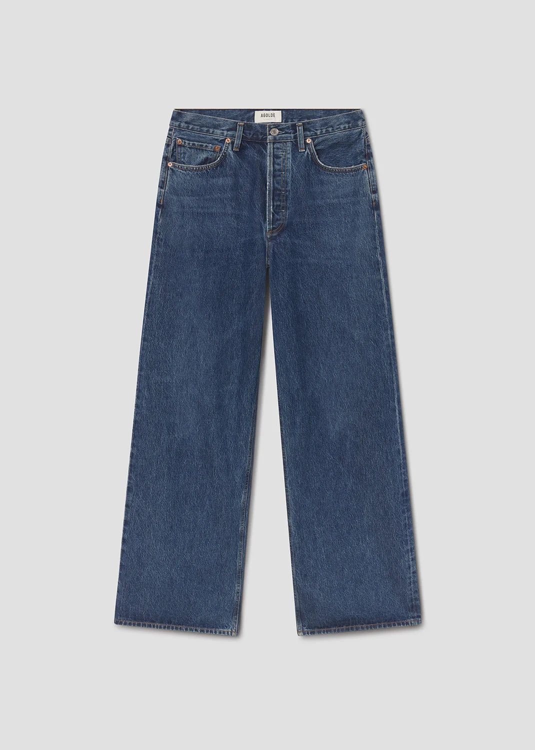 The Dame Jean features a flattering high rise and a wide leg with a clean, no-cuff finish. Crafted from rigid, non-stretch regenerative cotton denim with a soft hand, this dark vintage indigo wash is subtly marbled for a time-worn effect. Pair with a tucked-in tee or slim tank for an easy, elongated silhouette. Now available in a 29.5" inseam. This fit is true to size. For a longer inseam, shop the Dame High Rise Wide Leg Looks Like: Dark vintage indigo denim pant Feels Like: Rigid, non stretch cotton denim with a soft hand for all day wearability MORE DETAILS Closure: Button Fly Rise: 12 1/4" Inseam: 29 1/2" Leg Opening: 24 3/4" Model is 5'10" and is wearing a Size 27 Fabric: 100% Regenerative Cotton Care Instructions: Machine wash cold inside out with like colors. Do not bleach. Tumble dry low. Made in Turkey with imported materials A287-1371-ENM