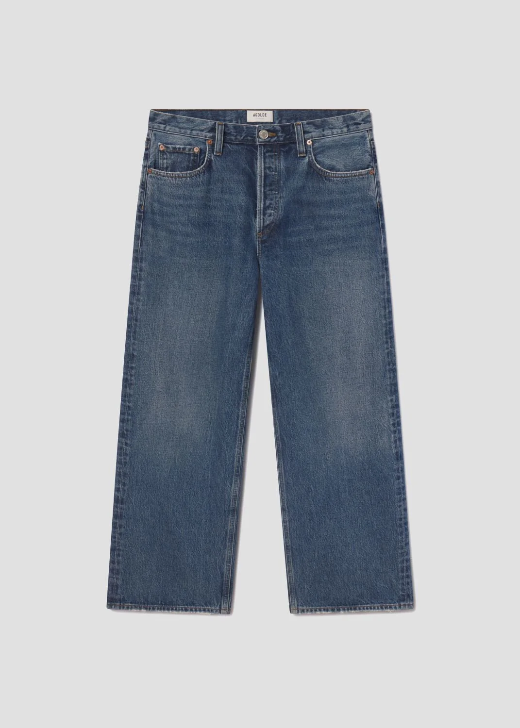 The Low Slung Baggy is designed for an effortless yet ultra-flattering fit, featuring a relaxed, upsized silhouette that sits low on the hips and falls into a directional baggy straight leg. Crafted from a blend of regenerative and recycled cotton, it offers both structure and an elegant drape. The dark indigo denim is finished with fading and light whiskering, giving it a naturally worn-in feel. Style it with a fitted tee and boots for a balanced silhouette or pair with an oversized blazer for a modern take on relaxed tailoring This fit is true to size. Looks Like: Dark indigo denim with fading and light whiskering Feels Like: Rigid, non stretch denim cotton blend made with a soft hand feel MORE DETAILS Closure: Button Fly Rise: 12 1/4" Inseam: 30 1/2" Leg Opening: 21" Model is 5'10" and is wearing a Size 27 Fabric: 67% Regenerative Cotton 22% Recycled Lyocell 11% Post consumer Recycled Cotton Care Instructions: Machine wash cold inside out with like colors. Do not bleach. Tumble dry low. Made in Turkey with imported materials A9079B-1535-ESS