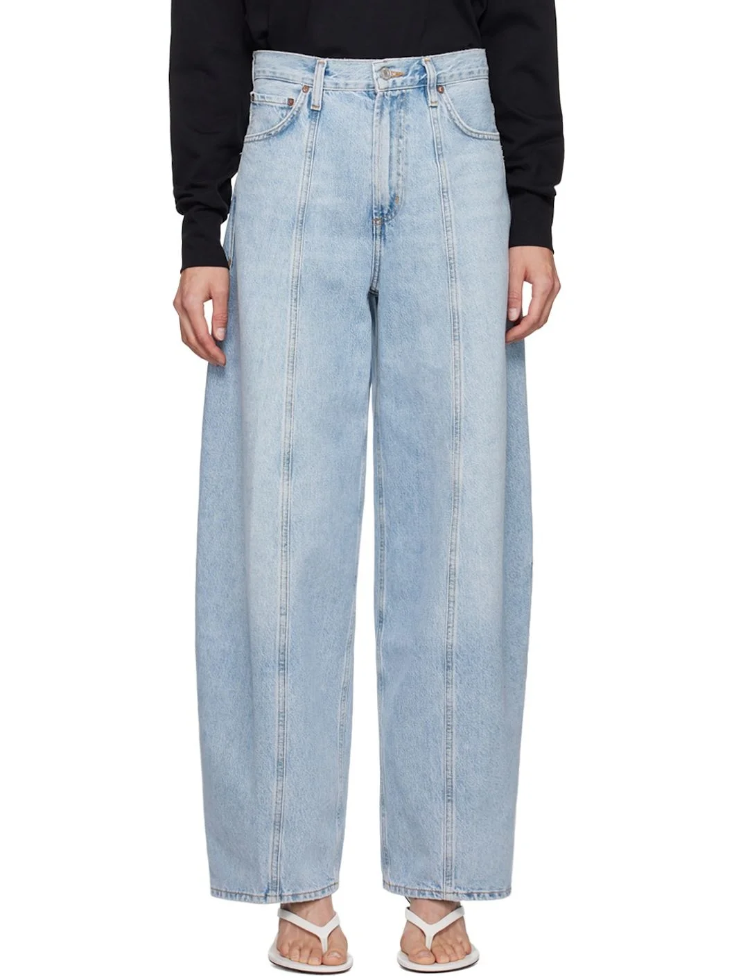 Relaxed-fit wide-leg non-stretch regenerative cotton denim jeans. Fading, whiskering, and subtle distressing throughout. · Paneled construction · High-rise · Belt loops · Five-pocket styling · Button-fly · Logo-engraved copper- and silver-tone hardware · Contrast stitching in tan Supplier color: Exposure