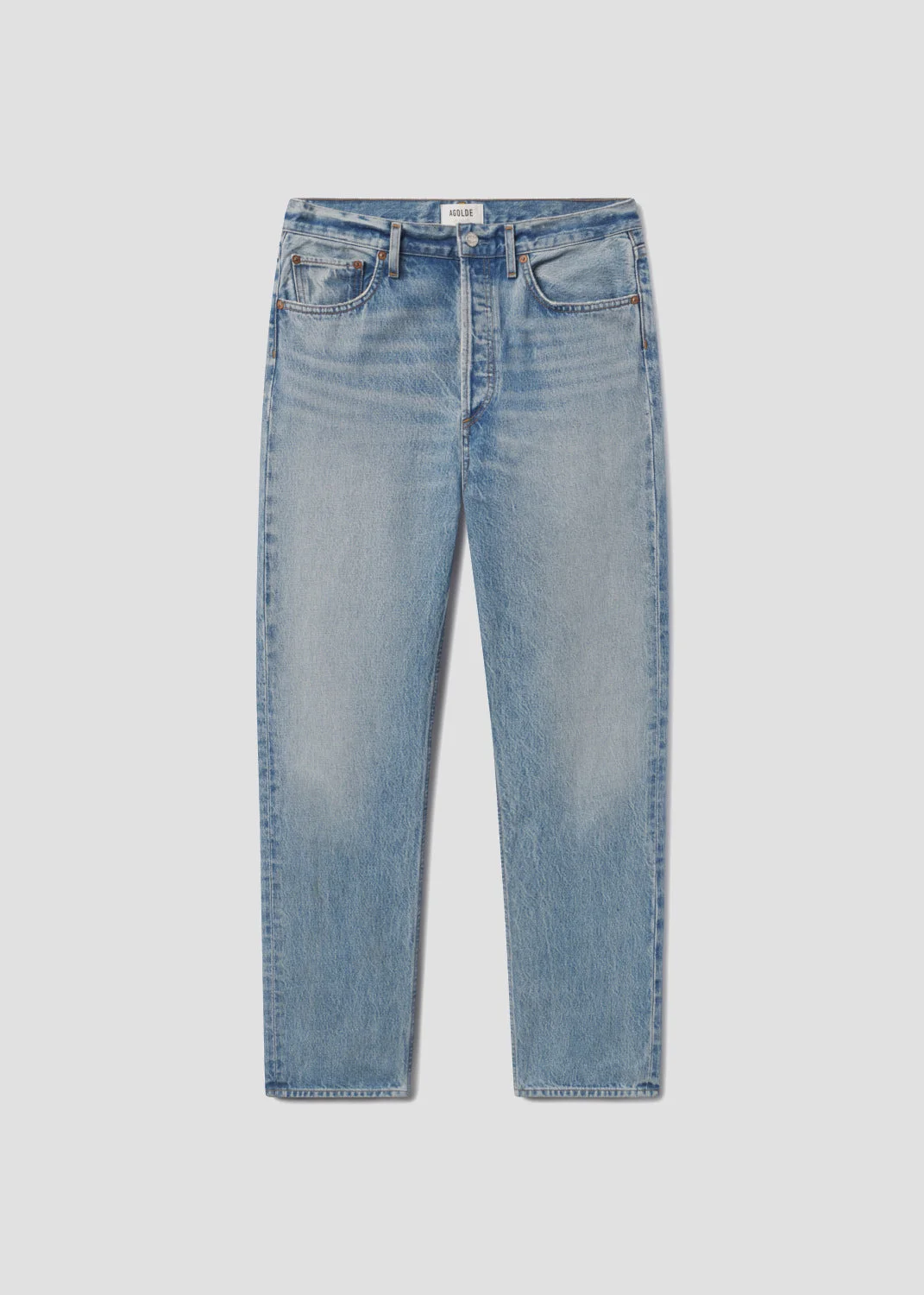 A vintage-inspired fit with a modern feel. The 90’s Pinch Waist features a flattering high-rise waist with a close-fitting top block that hugs through the hips before falling into a classic straight leg. Crafted from a blend of regenerative cotton, post-consumer recycled cotton, and just the right amount of stretch, this pair offers the perfect balance of structure and comfort. Finished in a pale indigo wash and a full-length inseam, it’s endlessly versatile—style it with anything and everything for effortless, everyday wear This wash is true to size but if you prefer more ease, we suggest sizing up. Looks Like: Light indigo with heavy whiskering, fading and marbling Feels Like: Rigid, non stretch denim cotton blend made with a soft hand feel MORE DETAILS Closure: Button Fly Rise: 12 3/4" Inseam: 29 1/2" Leg Opening: 15 1/2" Model is 5'10" and is wearing a Size 27 Fabric: 67% Regenerative Cotton 22% Recycled Lyocell 11% Post Consumer Recycled Cotton Care Instructions: Machine wash cold inside out with like colors. Do not bleach. Tumble dry low. Made in Turkey with imported materials A154C-1535_INFNT