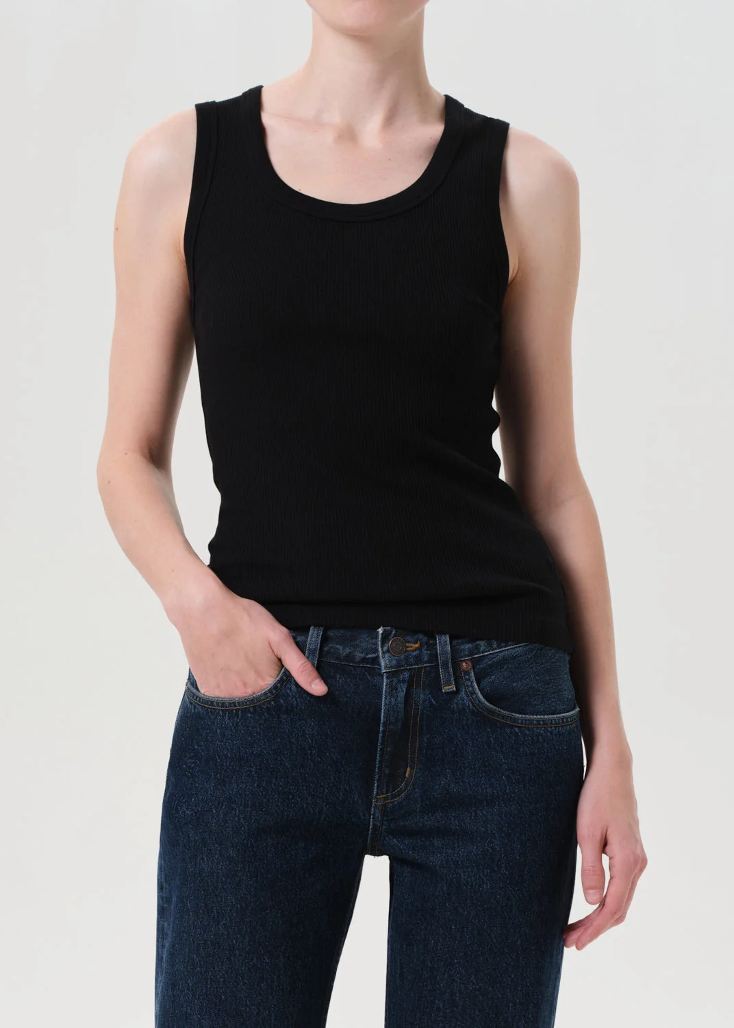 Our iconic Poppy is the ultimate go-with-anything wardrobe staple. Crafted from organic cotton rib fabric, it offers a supportive yet breathable feel. Designed to fit close to the body, it features a flattering U-shape neckline that’s perfect for layering or wearing on its own. A versatile piece that seamlessly complements any outfit. This fit is true to size. Looks Like: Stark black scoop neck rib tank Feels Like: Ultra soft and supportive ribbed cotton with just the right amount of stretch that holds its shape MORE DETAILS Body Length: 23" Shoulder to Shoulder: 11" Total Chest: 25" Model is 5'10" and wearing a size Small Fabric: 49% Organic Cotton 49% Tencel Lyocell 2% Spandex Care Instructions: Machine wash cold. Made in USA with imported materials A7056-1260_BLK