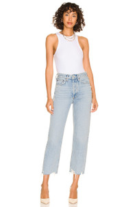 - 100% organic cotton - Made in Turkey - Machine wash - Button fly.5-pocket styling - Light whiskering and intentionally destroyed detail - Rigid denim fabric with frayed hem.14.5" at the knee narrows to 12" at the leg opening - Revolve Style No. AGOL-WJ383 - Manufacturer Style No. A173-1206