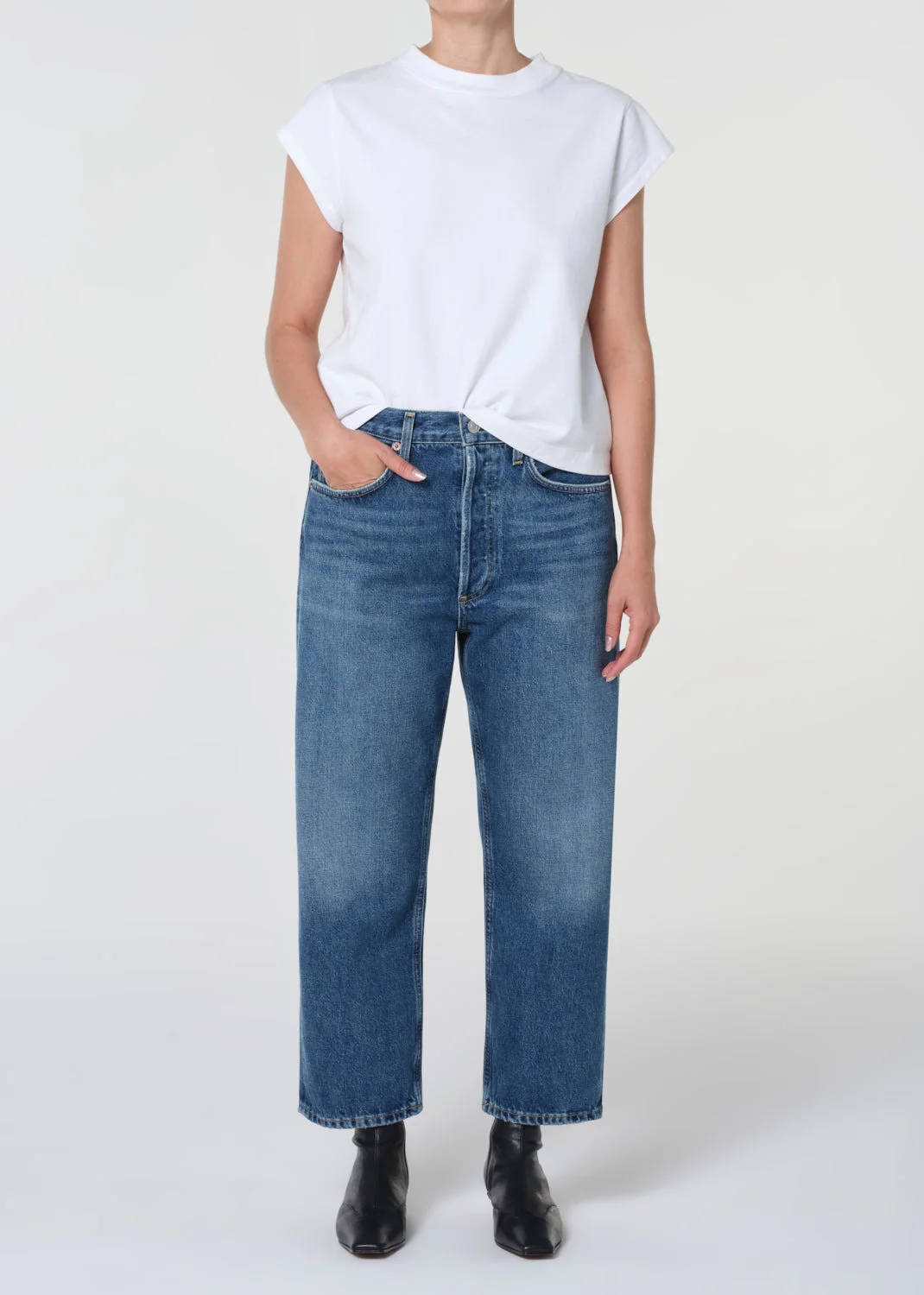 This cropped version of our best-selling 90’s Jean is now available in a shorter inseam. It comes in a medium vintage indigo with subtle fading, marbling, and whiskering details that give it a vintage-inspired look. The mid-rise fit sits relaxed at the waist and flows into a loose straight leg. Crafted from rigid, non-stretch 100% regenerative cotton denim, it offers a soft hand feel that only gets better with wear. For the full-length version, shop the 90's Jeans. This fit is intended to be relaxed. Size down for a higher, closer fit. Looks Like: Medium vintage indigo denim pant Feels Like: Rigid, non stretch cotton denim with a soft hand for all day wearability MORE DETAILS Closure: Button Fly Rise: 11 7/8" Inseam: 24" Leg Opening: 15 3/4" Model is 5'3" and is wearing a Size 27 Fabric: 100% Regenerative Cotton Care Instructions: Machine wash cold inside out with like colors. Do not bleach. Tumble dry low. Made in Turkey with imported materials A255-1810-BNTY