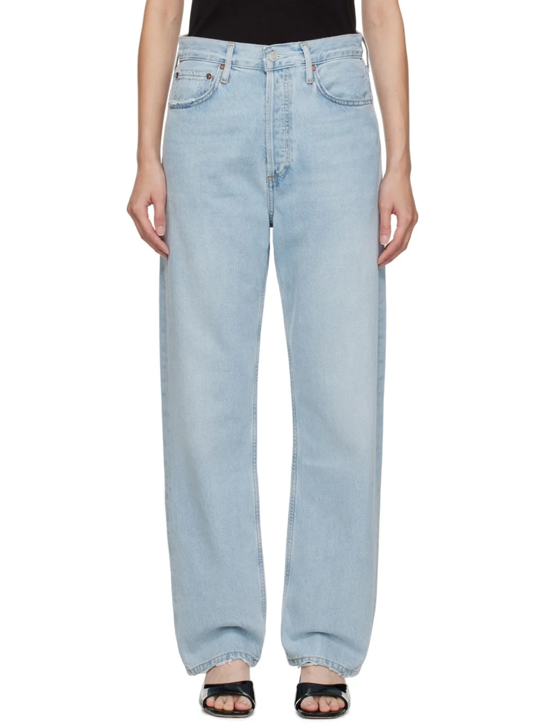 Slim-fit straight-leg stretch organic cotton denim jeans. Fading, whiskering, subtle distressing throughout. · High-rise · Belt loops · Five-pocket styling · Button-fly · Contrast stitching in tan Supplier color: Reputation