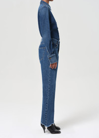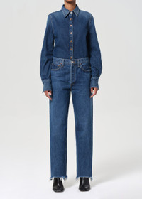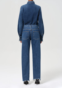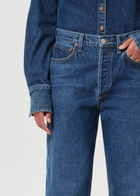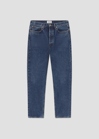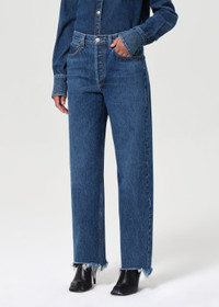 A bright, medium indigo denim with a raw, frayed hem for a cool, undone look. This mid-rise jean features a relaxed fit through the thigh and straight leg, crafted from rigid, non-stretch 100% regenerative cotton denim. Style with a sleek tank top and strappy heels for a modern take on laid-back chic, or pair with a relaxed oversized shirt and sandals for effortless summer styling. For the shorter inseam, shop the 90's Crop. This fit is intended to be relaxed. Size down for a higher, closer fit. Looks Like: Bright medium indigo denim pant with frayed hem Feels Like: Rigid, non stretch cotton denim with a soft hand for all day wearability MORE DETAILS Closure: Button Fly Rise: 12 1/2" Inseam: 29" Leg Opening: 16" Model is 5'10" and is wearing a Size 27 Fabric: 100% Regenerative Cotton Care Instructions: Machine wash cold inside out with like colors. Do not bleach. Tumble dry low. Made in Turkey with imported materials A069E-1371-FOTA