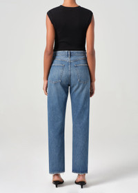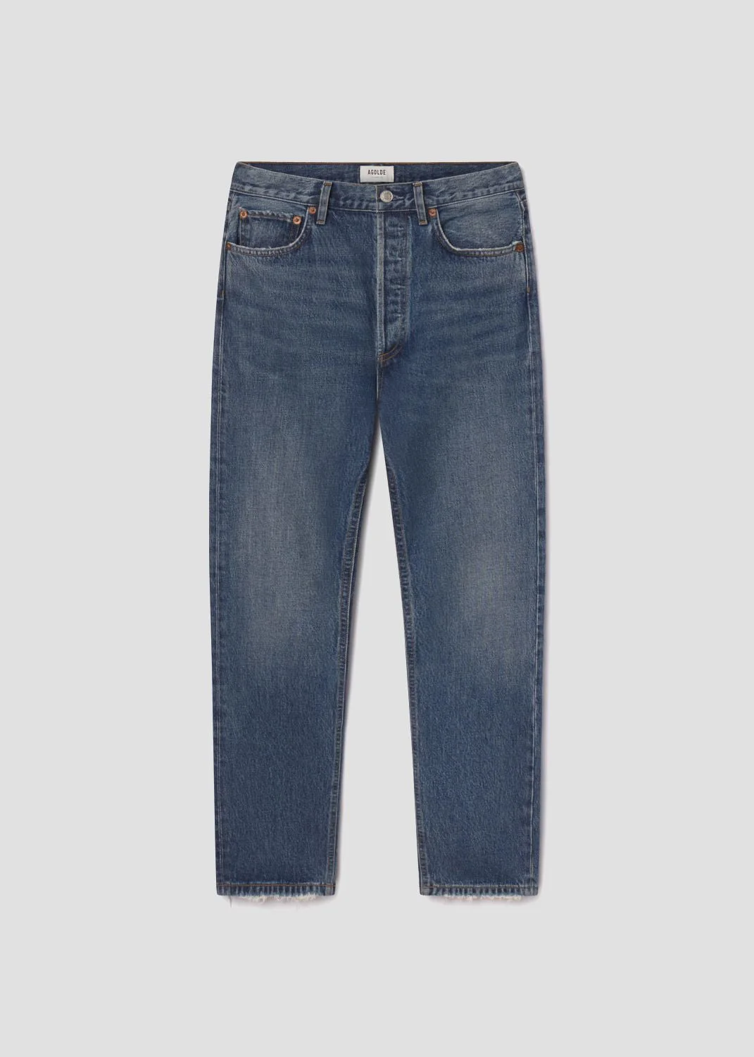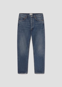 A vintage-inspired fit with a modern feel. The 90’s Pinch Waist features a flattering high-rise waist with a close-fitting top block that hugs through the hips before falling into a classic straight leg. Crafted from a blend of regenerative cotton, post-consumer recycled cotton, and just the right amount of stretch, this pair offers the perfect balance of structure and comfort. Finished with a full-length inseam, it’s endlessly versatile—style it with anything and everything for effortless, everyday wear. This fit is true to size. Looks Like: Dark indigo denim with fading and light whiskering Feels Like: Rigid, non stretch denim cotton blend made with a soft hand feel MORE DETAILS Closure: Button Fly Rise: 12 3/4" Inseam: 29 1/2" Leg Opening: 15 1/2" Model is 5'10" and is wearing a Size 27 Fabric: 67% Regenerative Cotton 22% Recycled Lyocell 11% Post Consumer Recycled Cotton Care Instructions: Machine wash cold inside out with like colors. Do not bleach. Tumble dry low. Made in Turkey with imported materials A154D-1535_ENCE