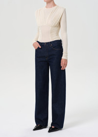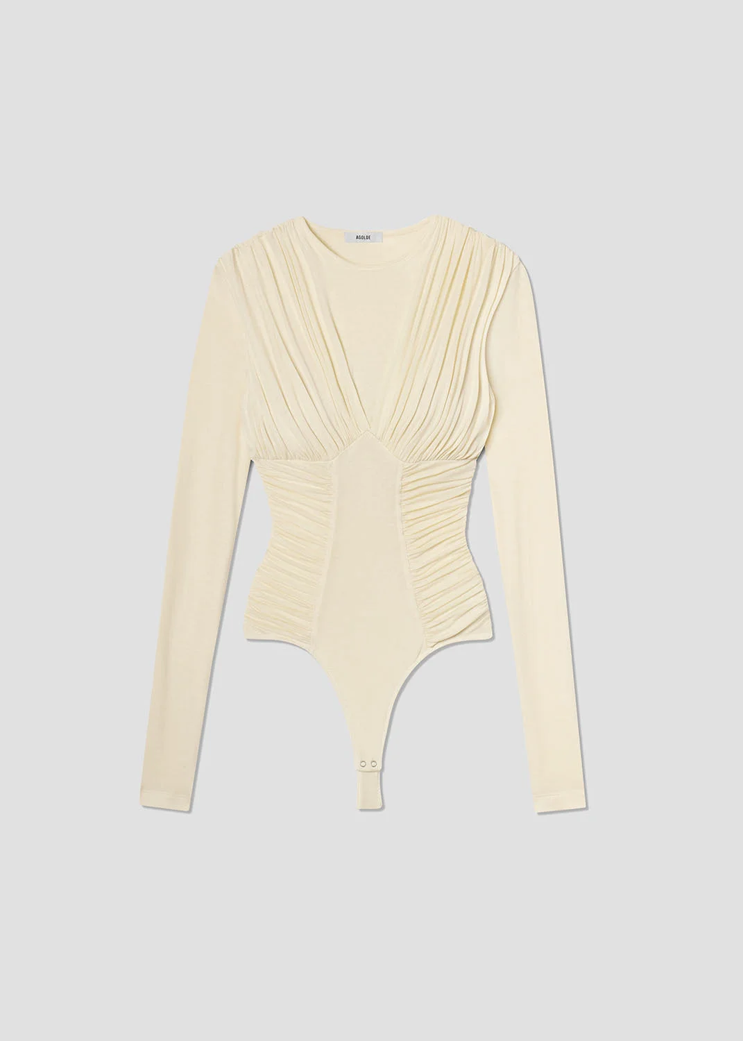 A long-sleeve bodysuit crafted from ultra-soft, lightweight fine needle rib for a smooth, flattering fit. True to size, it features subtle ruching details for texture and dimension. In a soft off-white, it layers effortlessly under tailored pieces or pairs seamlessly with high-rise denim for a refined, modern silhouette. This fit is true to size. Looks Like: Off white, cream long sleeve bodysuit with ruching detail Feels Like: Ultra-soft, lightweight fine needle baby rib MORE DETAILS Model is 5'10" and wearing a size Small Fabric: 94% Lyocell, 6% Spandex Care Instructions: Machine wash cold inside out with like colors. Do not bleach. Tumble dry low. Made in USA with imported materials A7412-1618-OATMK