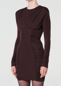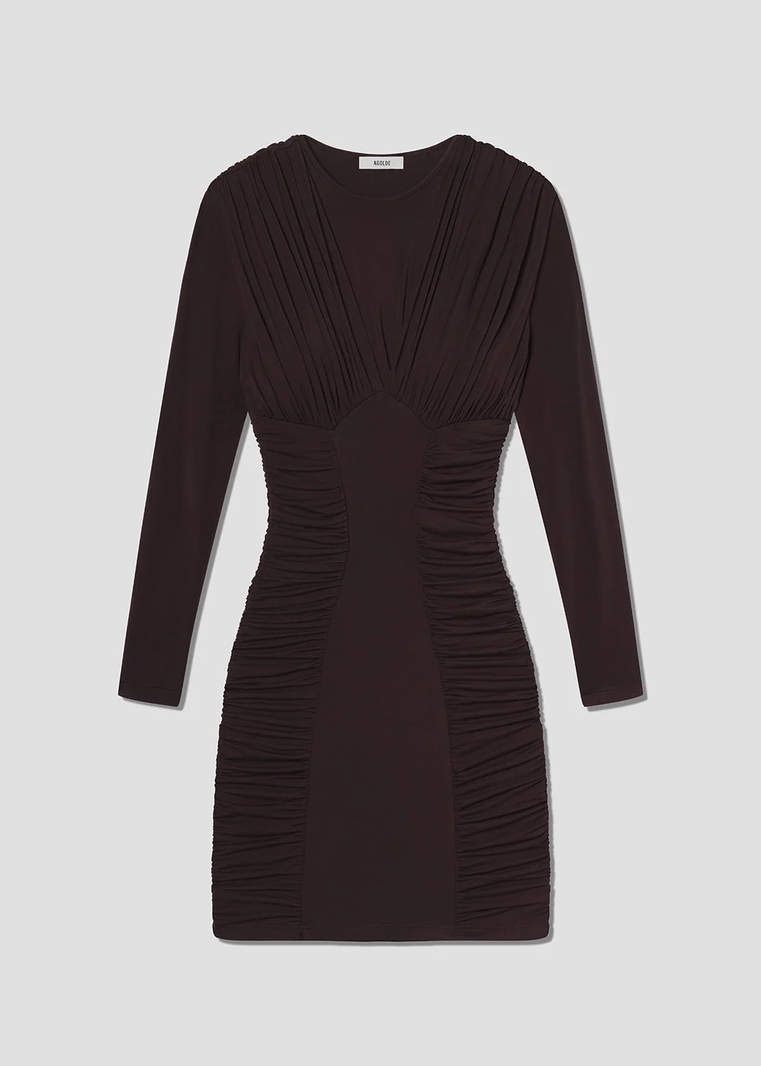 The Abbi Dress is a sleek long sleeve silhouette with subtle ruching for a flattering fit. Cut from ultra-soft lightweight baby rib, it offers gentle stretch and all-day comfort. A versatile essential that pairs effortlessly with boots or layered under jackets. This fit is true to size. Looks Like: Dark brown long sleeve dress with ruching detail Feels Like: Ultra-soft, lightweight fine needle baby rib MORE DETAILS Body Length: 32 1/2" Chest: 26" Shoulder to Shoulder: 13" Sleeve Length: 25 3/4" Model is 5'10" and wearing a size Small Fabric: 94% Lyocell, 6% Spandex Care Instructions: Machine wash cold. Made in USA with imported materials A20009-1618-ROTO