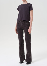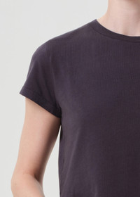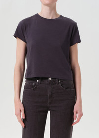 The Adine is a wardrobe essential, crafted from breathable, ultra-soft organic cotton. Perfect for wearing solo or layering, it pairs effortlessly with denim shorts or low-rise jeans for a timeless, flattering look. This fit is true to size. Looks Like: Dark grey shrunken tee with purple tones Feels Like: Lightweight ultra soft jersey cotton MORE DETAILS Body Length: 19 3/4" Chest: 37" Sweep: 36 1/2" Shoulder to Shoulder: 15" Sleeve Length: 5 1/4" Model is 5'10" and wearing a size Small Fabric: 100% Organic Cotton Care Instructions: Machine wash cold. Made in USA with imported materials A7180-1507-SADE