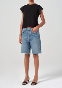 When you need more than just a basic tee—meet the Bryce. Crafted from 100% breathable, ultra-soft cotton, it’s perfect for wearing solo or layering. The angled sleeves add a modern touch, creating a fresh and flattering silhouette that effortlessly elevates any look. This fit is true to size. Looks Like: Stark black crewneck tee with cap sleeves Feels Like: Lightweight jersey with an easy drape for all day wearability MORE DETAILS Body Length: 21 1/4" Shoulder to Shoulder: 15 1/2" Sleeve Length: 3 1/2" Chest: 38" Sweep: 39" Model is 5'10" and wearing a size Small Fabric: 100% Cotton Care Instructions: Machine wash cold. Made in USA with imported materials A7207-1521_BLK