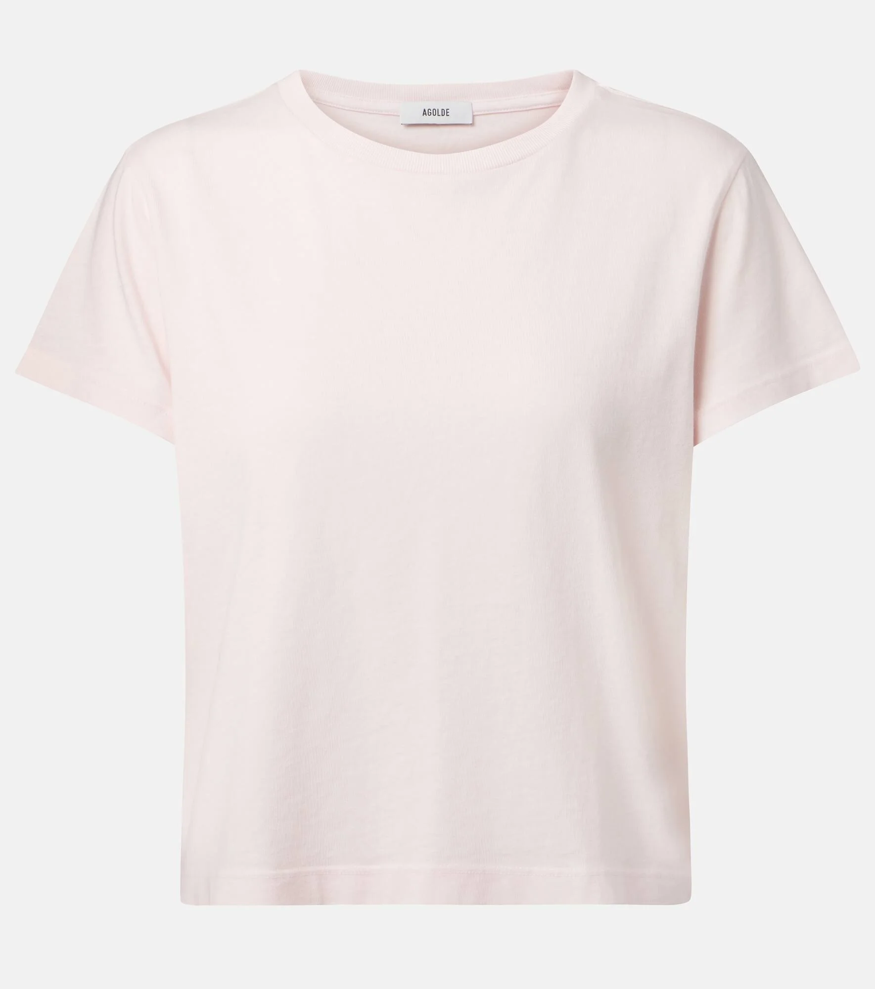 Build your staples collection around pieces like the Adine Shrunken T-shirt from Agolde. Made from a breathable and lightweight cotton jersey, this crewneck style is perfect for layering. Product Details - Material: 100% cotton - Care instructions: machine wash cold - Made in the USA - Designer color name: Cosmos - Item color: pink - Item number: P01057521 Size & Fit - True to size - Designed for a loose fit - Slightly stretchy fabric - Slightly cropped - The model seen in the picture is 178cm-5'10" and wearing a size XS
