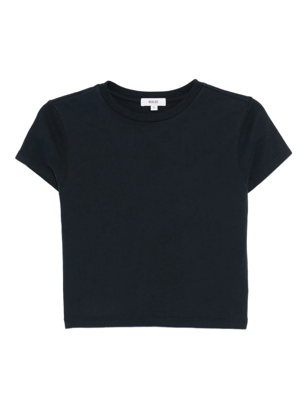 Adine shrunken T-shirt Highlights - Dark navy - Short sleeves - Round neck Made in United States Composition Organic Cotton 100% SIZE & FIT Model measurements Height 5 ft 10 in(1.77 m) Bust/Chest 29.33 in(74.5 cm) Hips 32.28 in(82 cm) Waist 24.01 in(61 cm) FittingInformation Designed for a slim fit that sits just away from the body offering a close yet comfortable fit Made from a midweight non-stretch fabric, this piece offers minimal elasticity when worn Washing instructions Hand Wash