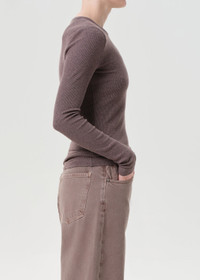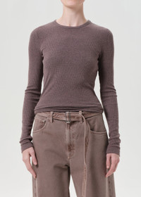 The Delphi Slim Tee is a fitted long sleeve crewneck with a flattering ribbed texture. Crafted from midweight fabric, it offers a sleek, streamlined fit ideal for layering or wearing solo. Looks Like: Dark dusty vintage rose-toned fitted long sleeve crewneck tee Feels Like: Midweight intermingle chunky rib that hugs the body MORE DETAILS Body Length: 25" Chest: 27" Shoulder to Shoulder: 13" Sleeve Length: 25" Model is 5'10" and wearing a size Small Fabric: 50% Polyester, 32% Cotton, 18% Rayon Care Instructions: Machine wash cold. Made in USA with imported materials A7230-1352-RAMI