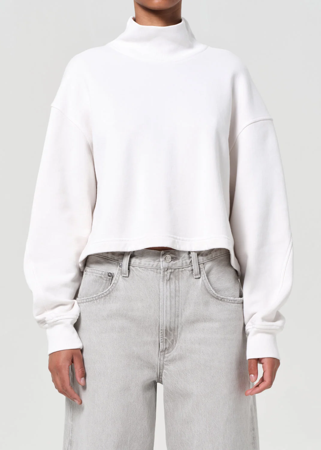 The Isra Sweatshirt is a relaxed, cropped silhouette with a structured mock neck and voluminous sleeve. Pair with denim or tonal sweats for a clean, sculptural off-duty look. This fit is true to size. Looks Like: Light grey relaxed mock neck sweatshirt Feels Like: Heavyweight brushed fleece with a warm, plush hand MORE DETAILS Model is 5'10" and wearing a size Small Fabric: 100% Supima Cotton Care Instructions: Machine wash cold. Made in USA with imported materials A7397-1697-WRED