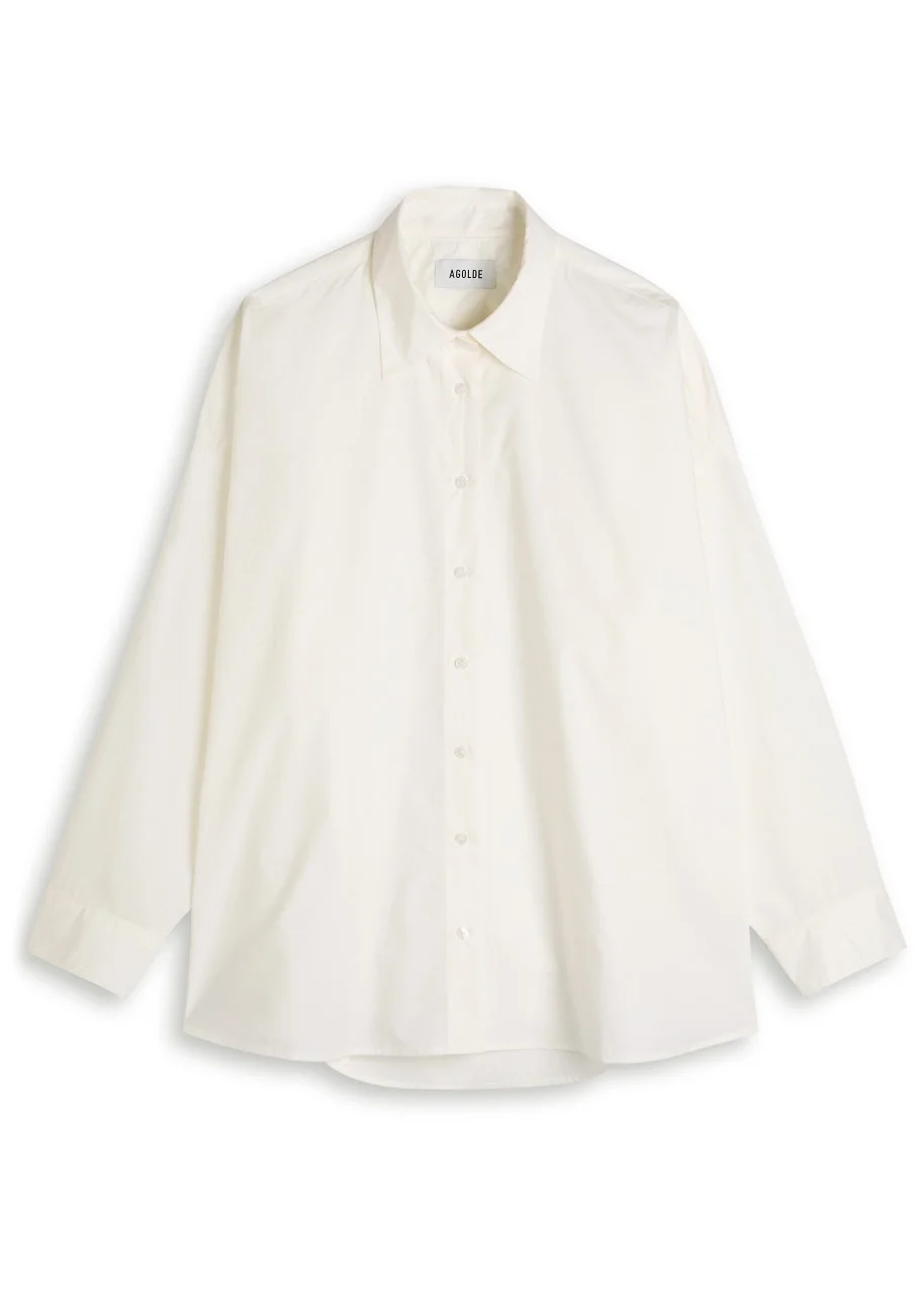 Info & Care Agolde cotton-poplin shirt Dropped shoulders, pleats at button-fastening cuffs, curved hem Button fastenings through front 100% cotton Machine wash Size & Fit Length shoulder to hem: 28 inches/ 71cm Midweight Relaxed fit Model is 5'10"/ 178cm and wears a size small