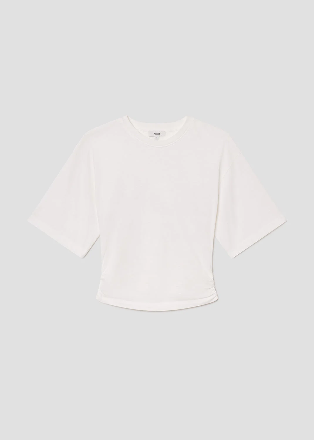 A fresh take on the classic white tee. The Shari is cut from lightweight cotton jersey with exaggerated short sleeves and a slightly cropped fit. This fit is true to size. Looks Like: Clean white exaggerated short sleeve tee Feels Like: Lightweight jersey cotton MORE DETAILS Body Length: 19" Chest: 38" Sweep: 28 1/2" Shoulder to Shoulder: 20 3/8" Sleeve Length: 9 7/8" Model is 5'10" and wearing a size Small Fabric: 100% Cotton Care Instructions: Machine wash cold. Made in USA with imported materials A7392-1521-WHT