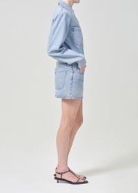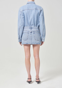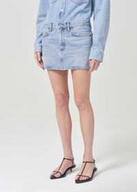 Crafted in our signature regenerative cotton, the Alek mini skirt features classic 5-pocket detailing and a clean, finished hem. It pairs perfectly with a denim jacket for a chic, head-to-toe denim look, or style with a simple tee and sneakers for a more relaxed vibe. This fit is true to size. Looks Like: Vintage marbled light indigo denim skirt with fading, whiskering and a clean hem Feels Like: Rigid, non stretch cotton denim with a soft hand for all day wearability MORE DETAILS Closure: Zipper Fly Waist: 33" Front Length: 12 1/2" Back Length: 13 3/4" Sweep: 39 3/4" Model is 5'10" and is wearing a Size 27 Fabric: 100% Organic Cotton Care Instructions: Machine wash cold inside out with like colors. Do not bleach. Tumble dry low. Made in Turkey with imported materials A3061-1206-FORCE