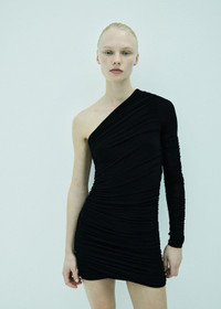 The Annette Dress features an asymmetrical one sleeve silhouette with subtle ruching for a flattering fit. Cut from ultra-soft lightweight baby rib, it offers gentle stretch and all-day comfort. Perfect for dressing up or layering for a modern look. This fit is true to size. Looks Like: True black asymmetrical one sleeve dress with ruching detail Feels Like: Ultra-soft, lightweight fine needle baby rib MORE DETAILS Body Length: 34" Chest: 28 1/2" Hip: 27" Sleeve Length: 26" Model is 5'10" and wearing a size Small Fabric: 94% Lyocell, 6% Spandex Care Instructions: Machine wash cold. Made in USA with imported materials A20007-1618-BLK