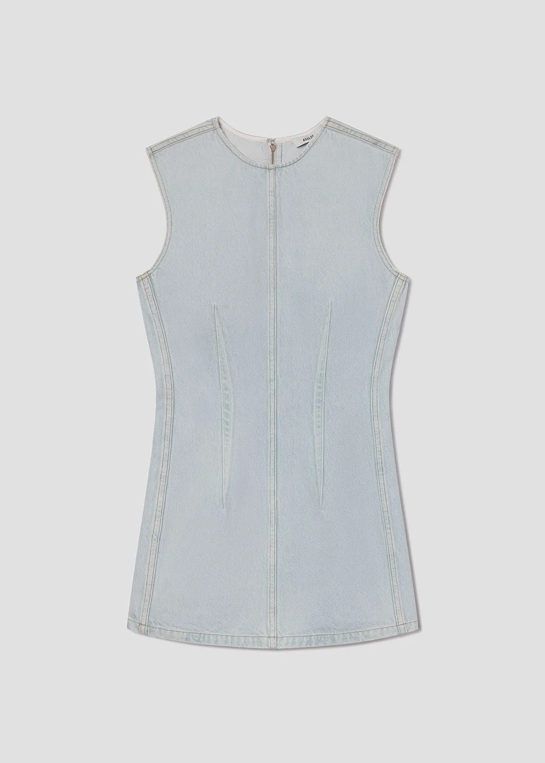 The Barton Dress is a refined take on denim with a sleek, sculpted silhouette. Designed in a light faded indigo wash, it features a tank-style neckline, mini length, and structured seaming that flatters and elongates the body. Crafted from non-stretch regenerative cotton denim with a soft hand feel, it offers everyday comfort while maintaining its clean, tailored shape. This fit is true to size. Looks Like: Light faded indigo denim tank mini dress Feels Like: Rigid, non stretch cotton denim with a soft hand for all day wearability MORE DETAILS Model is 5'10" and wearing a size Small Fabric: 100% Regenerative Cotton Care Instructions: Machine wash cold. Made in USA with imported materials A20006C-1206-SLCT