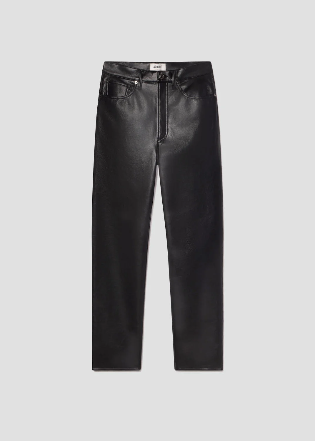 Inspired by two of our best-selling styles. Featuring a flattering high-rise waist with a close-fitting top block through the hips. The easy, classic straight leg that is finished with now a longer inseam, makes for the ideal pair back to a cozy sweater in the cooler weather. This fit is true to size. Looks Like: Luxe black with a matte finish Feels Like: Buttery, genuine recycled leather with some slight stretch for ease MORE DETAILS Closure: Zipper Fly Rise: 12" Inseam: 32" Leg Opening: 15 1/2" Model is 5'10" and is wearing a Size 27 Fabric: 50% Recycled Leather, 30% Polyurethane, 10% Viscose, 10% Polyester Care Instructions: Machine wash cold inside out with like colors. Do not bleach. Tumble dry low. Made in USA with imported materials A204-1285-DETOX