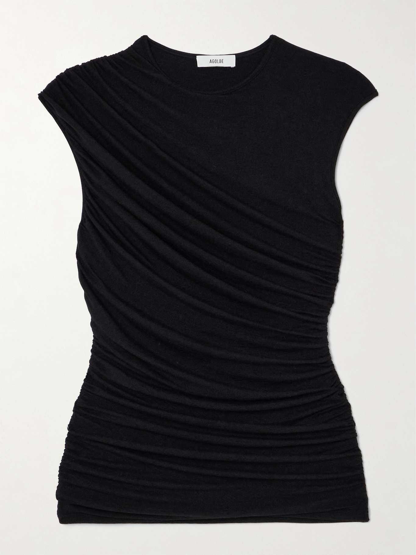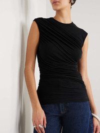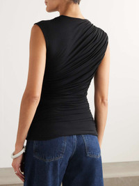 EDITORS'NOTES AGOLDE's 'Ester' tank top is ruched at the shoulder and side seams to create a beautiful asymmetric drape. It's made from stretch-TENCEL™ Lyocell jersey in a close fit and has a high neckline. Lower-Impact Materials. This product is made using at least 50% lower-impact materials or ingredients. Find out more about our NET SUSTAIN criteria here. SIZE & FIT Model measurements: - Fits true to size, take your normal size - Designed for a close fit - Mid-weight, stretchy fabric - Model is 177cm/ 5'10" and is wearing a size Small - Bust: 85cm/ 33.5” - Waist: 62cm/ 24.5” - Hip: 91cm/ 36” DETAILS & CARE - Black stretch-TENCEL™ Lyocell jersey - Slips on - 94% TENCEL™ Lyocell, 6% elastane