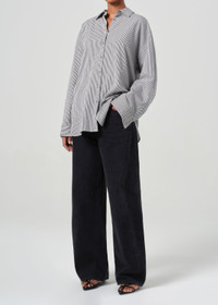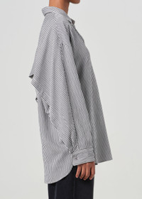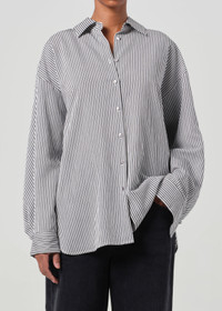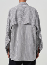 Crafted from an airy cotton-poplin, the Brona Shirt has billowy sleeves that complement the loose cut. This fit is true to size. Looks Like: Black and white mini stripe long sleeve button up collared shirt with trench detailing along the back Feels Like: Ultra lightweight non stretch poplin cotton MORE DETAILS Body Length: 31" Chest: : 49" Shoulder to Shoulder: 23" Sleeve Length 21 1/4" Model is 5'10" and wearing a size Small Fabric: 88% Viscose, 12% Polyamide Care Instructions: Machine wash cold inside out with like colors. Do not bleach. Tumble dry low. Made in USA with imported materials A7352-1790-SLNST