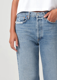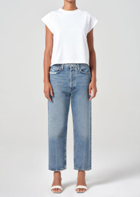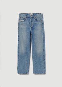 Our best-selling 90's Jean is updated with a cropped inseam, combining vintage-inspired style with a modern twist. The mid-rise fit sits relaxed at the waist, transitioning into a loose, straight leg for a laid-back, effortless silhouette. Made from regenerative cotton in a vintage indigo wash with subtle distressing, these jeans offer a timeless, breathable feel with just the right amount of structure. For a chic summer look, pair them with a breezy linen blouse and strappy sandals, or style with a sleek ribbed tank and minimal sneakers for a casual, elevated vibe. For the full-length version, shop the 90's Jeans. This fit is intended to be relaxed. Size down for a higher, closer fit. Looks Like: Medium vintage indigo denim with fading and whiskering Feels Like: Rigid, non stretch cotton denim with a soft hand for all day wearability MORE DETAILS Closure: Button Fly Rise: 12 1/2" Inseam: 26" Leg Opening: 15 3/4" Model is 5'10" and is wearing a Size 27 Fabric: 100% Organic Cotton Care Instructions: Machine wash cold inside out with like colors. Do not bleach. Tumble dry low. Made in Turkey with imported materials A173F-1206_HOOK