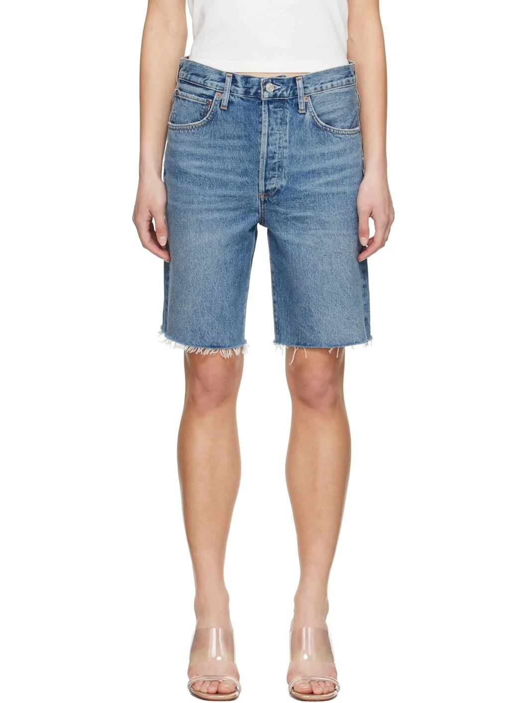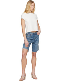 Non-stretch regenerative cotton denim shorts. Fading, whiskering, and subtle distressing throughout. · Relaxed-fit · Mid-rise · Belt loops · Five-pocket styling · Button fly · Frayed edge at cuffs · Logo-engraved silver- and copper-tone hardware · Contrast stitching in tan Supplier color: Ruin 100% regenerative cotton. Made in Turkey 251214F088006
