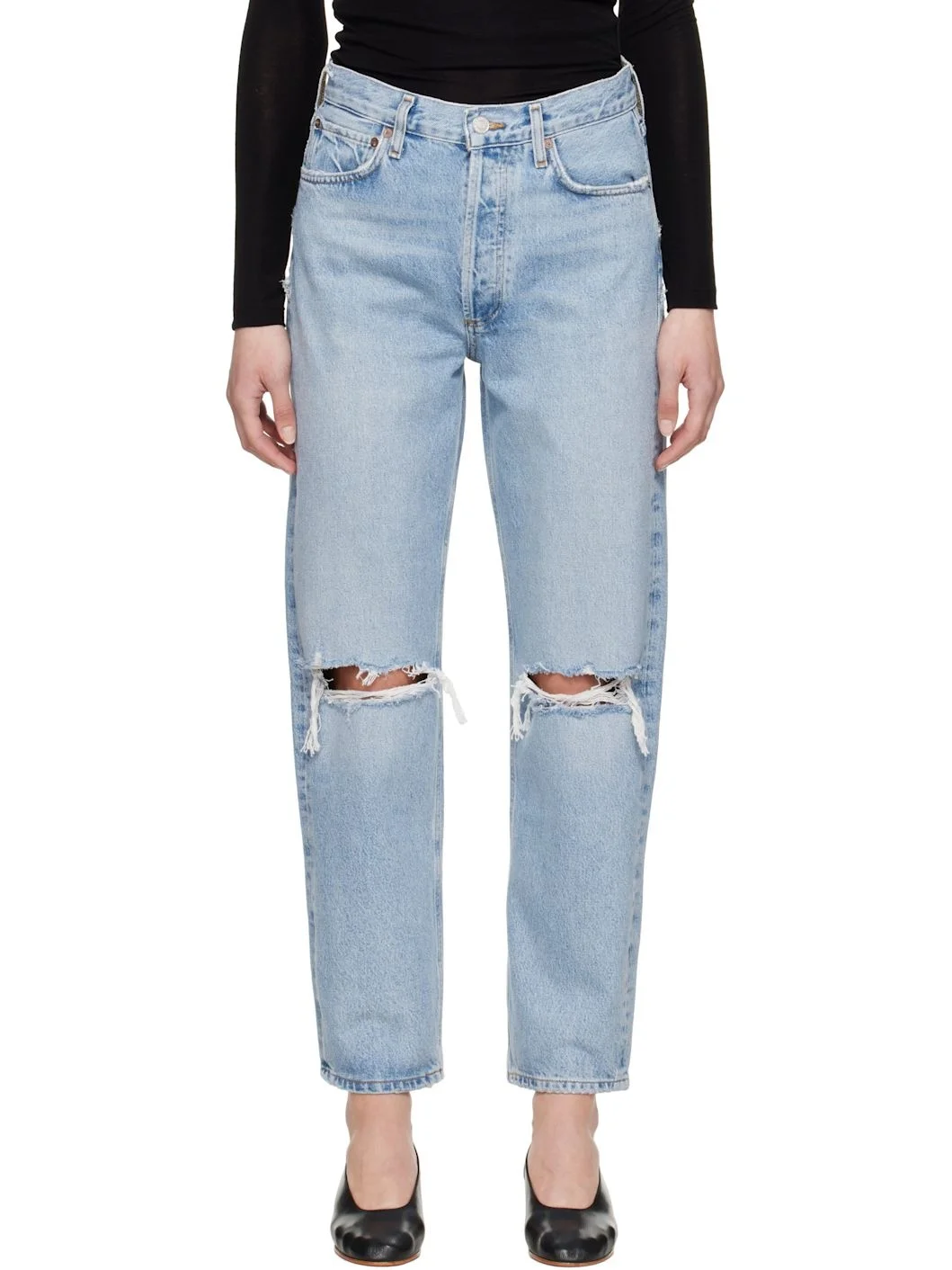 Non-stretch regenerative cotton denim jeans. Fading, whiskering, and distressing throughout. · Loose-fit and straight-leg · Mid-rise · Belt loops · Five-pocket styling · Button fly · Rip at knees · Logo-engraved silver- and copper-tone hardware · Contrast stitching in tan Supplier color: Alter 100% regenerative cotton. Made in Turkey 251214F069072