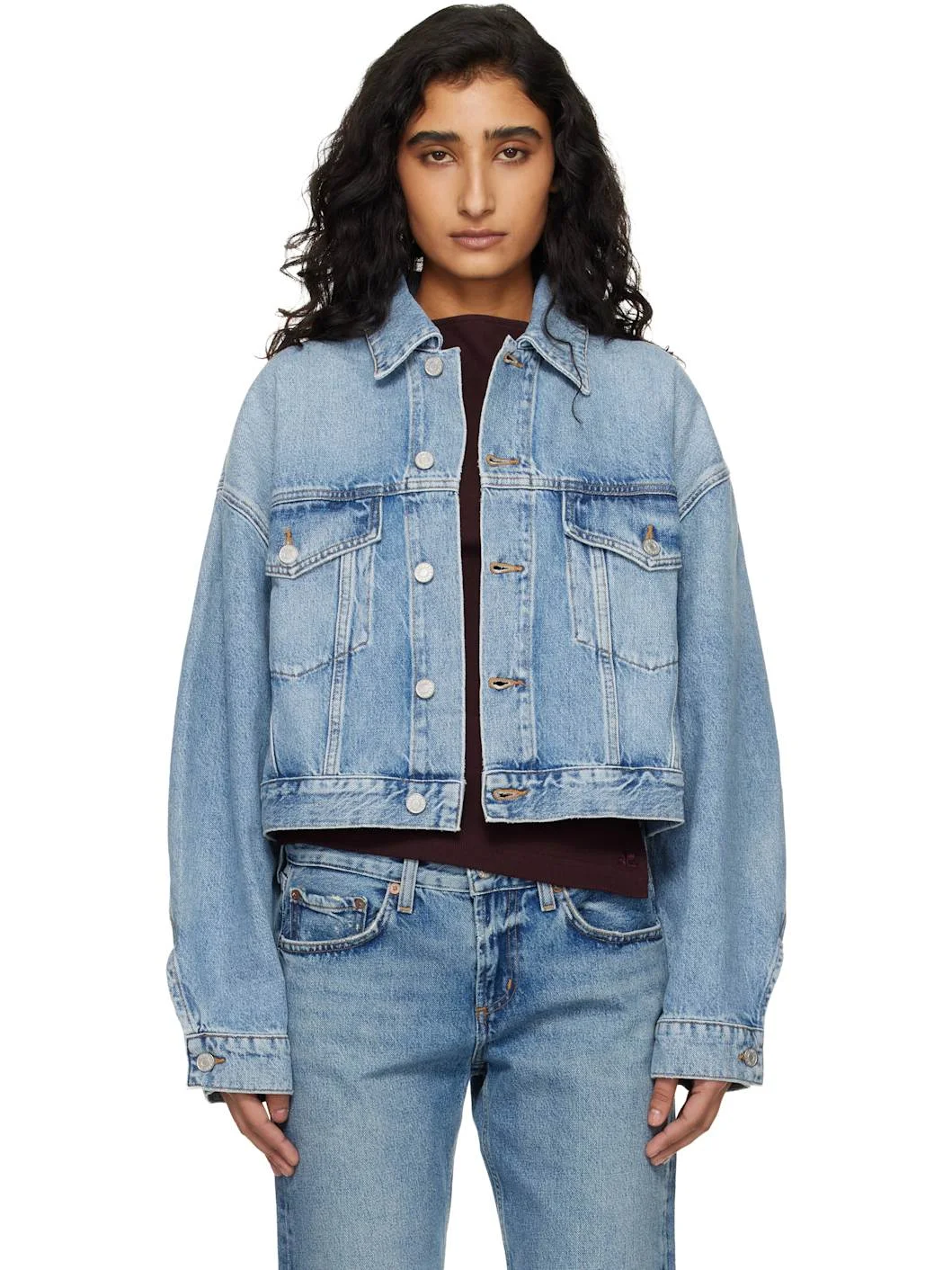 Non-stretch regenerative cotton denim jacket. · Fading throughout · Spread collar · Button closure · Flap pockets at chest · Cropped hem · Dropped shoulders · Balloon sleeves · Single-button barrel cuffs · Logo-engraved silver-tone hardware · Contrast stitching in tan Supplier color: Space Body: 100% regenerative cotton. Pocket lining: 100% cotton. Made in Turkey 261214F060002