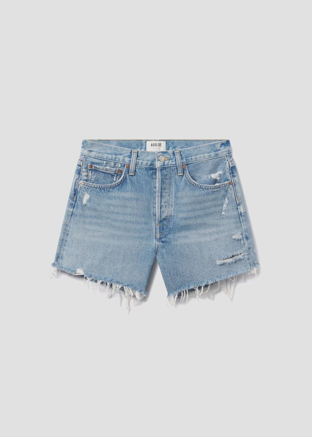 The Parker Long shorts are crafted from bright indigo denim with a vintage-inspired appeal, offering a relaxed high-rise and a comfortable fit through the thighs. Made from regenerative cotton, these shorts are a versatile wardrobe staple—effortlessly pairing with everything from casual tees to more elevated pieces. A true favorite, these shorts combine timeless style with everyday wearability. For the shorter inseam, shop our Parker Short. This fit is true to size. Looks Like: Bright indigo denim short with fading, whiskering, marbling and distressing Feels Like: Rigid, non stretch cotton denim with a soft hand for all day wearability MORE DETAILS Closure: Button Fly Rise: 11 1/4" Inseam: 4 1/2" Leg Opening: 24 1/2" Model is 5'10" and is wearing a Size 27 Fabric: 100% Cotton Care Instructions: Machine wash cold inside out with like colors. Do not bleach. Tumble dry low. Made in Turkey with imported materials A9010-811_SWAP