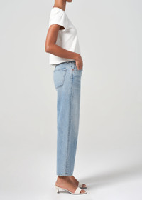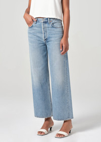 AGOLDE's Ren jeans from the Weightless Collection offer the perfect blend of comfort and style. Made from 100% cotton, they feature a high-rise waist and cropped wide legs for a relaxed yet flattering silhouette. The lightweight fabric ensures all-day comfort, making them ideal for casual wear. Pair them with a half-tucked tee for a cool, effortless look. This fit is true to size. For a shorter inseam, shop the Ren Jean Petite 25" Looks Like: Vintage medium indigo with fading and whiskering Feels Like: Weightless zero stretch with denim cotton with an easy drape MORE DETAILS Closure: Button Fly Rise: 12 1/4" Inseam: 27 1/2" Leg Opening: 19 1/2" Model is 5'10" and is wearing a Size 27 Fabric: 100% Cotton Care Instructions: Machine wash cold inside out with like colors. Do not bleach. Tumble dry low. Made in Turkey with imported materials A213-983-DISCL