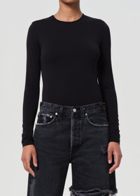 The Aura Long Sleeve Bodysuit in Black is a sleek, long sleeve crewneck crafted from a lightweight, second-skin fabric. Its form-fitting design offers both comfort and versatility, making it perfect for layering or wearing solo. This fit is true to size. Looks Like: True black long sleeve crewneck bodysuit Feels Like: Lightweight second skin ultra-smooth elastane blend MORE DETAILS Body Length: 26 1/2" Chest: 29 1/2" Sweep: 28" Model is 5'10" and wearing a size Small Fabric: 80% Polyamide, 20% Elastane Care Instructions: Machine wash cold inside out with like colors. Do not bleach. Tumble dry low. Made in Portugal with imported materials A7294-1460-BLK