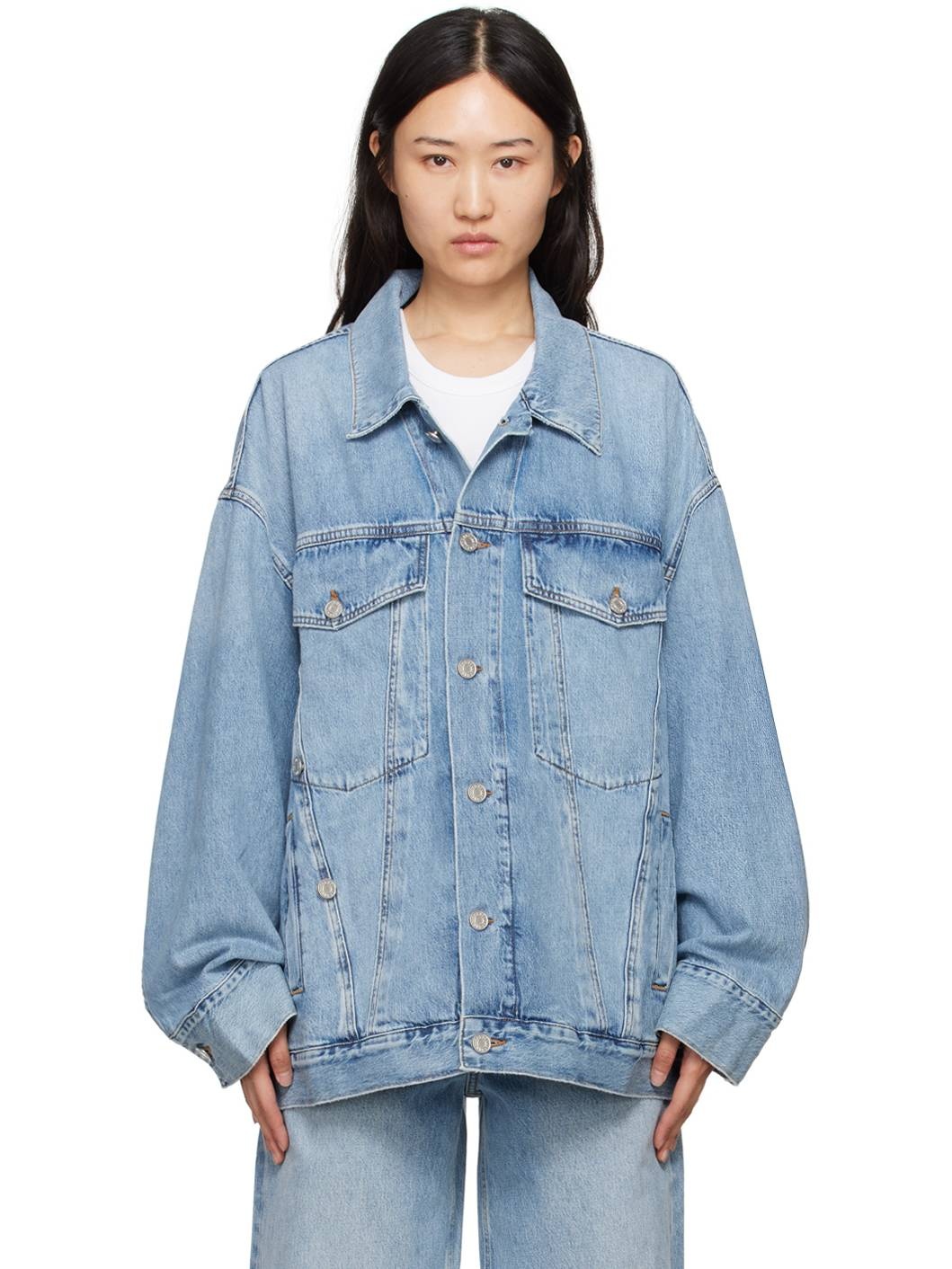 Relaxed-fit and non-stretch organic cotton denim jacket. Fading and subtle distressing throughout. · Spread collar · Button closure · Button fastening at front for alternate styling · Flap and welt pockets · Dropped shoulders · Double-button barrel cuffs · Adjustable button-tabs at back hem · Logo-engraved silver-tone hardware · Contrast stitching in tan Supplier color: Clarity