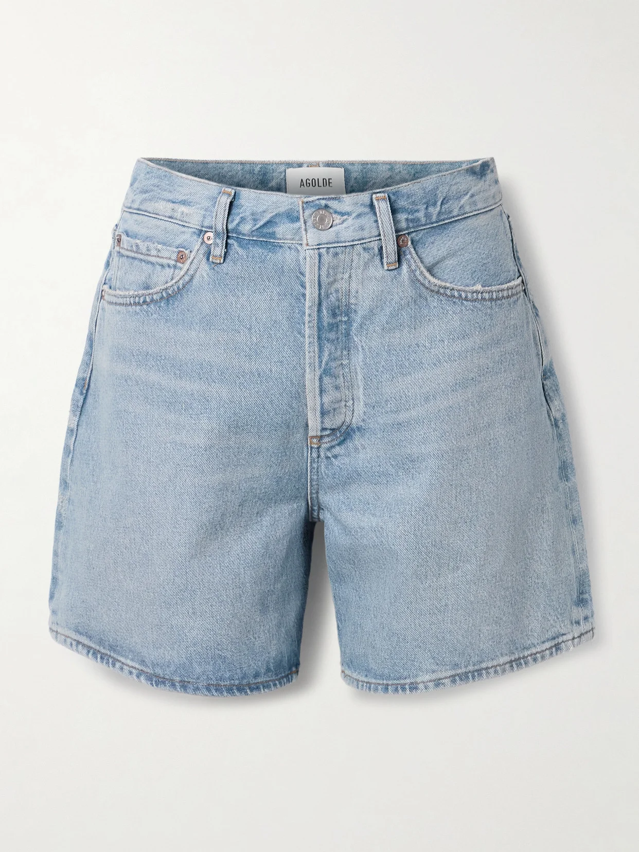 AGOLDE's 'Dame' shorts have a mid-rise waist and relaxed legs with a generous 6-inch inseam. They're made from cotton-denim in a light-blue wash the brand calls 'Coax'. Lower-Impact Materials. This product is made using at least 50% lower-impact materials or ingredients. Find out more about our NET SUSTAIN criteria here.
