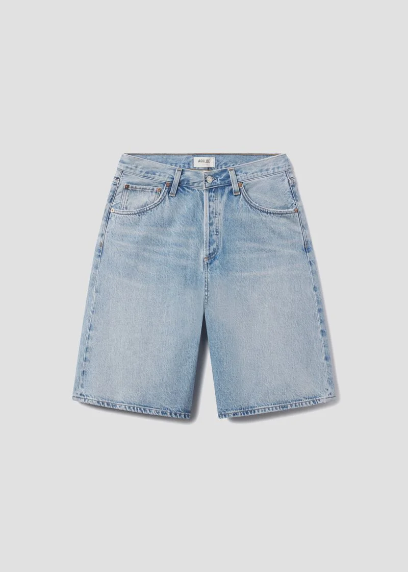 The Baggy V-Waist Short puts a fresh spin on a relaxed silhouette, featuring the signature high-pitched V-waist detail for a flattering, vintage-inspired touch. Crafted from 100% regenerative cotton, these shorts sit easy at the hips with a baggy fit that falls just at the knee. Finished with a crisp, clean hem, they strike the perfect balance between effortless and elevated—ideal for styling with anything from a fitted tank to an oversized button-down. This fit is true to size. Looks Like: Light marbled indigo denim short with clean hem Feels Like: Non stretch, weightless denim washed down for a soft to the touch feel MORE DETAILS Closure: Button Fly Rise: 10" Inseam: 12 3/4" Leg Opening: 28" Model is 5'10" and is wearing a Size 27 Fabric: 100% Regenerative Cotton Care Instructions: Machine wash cold inside out with like colors. Do not bleach. Tumble dry low. Made in Turkey with imported materials A9239-1765-PRVL