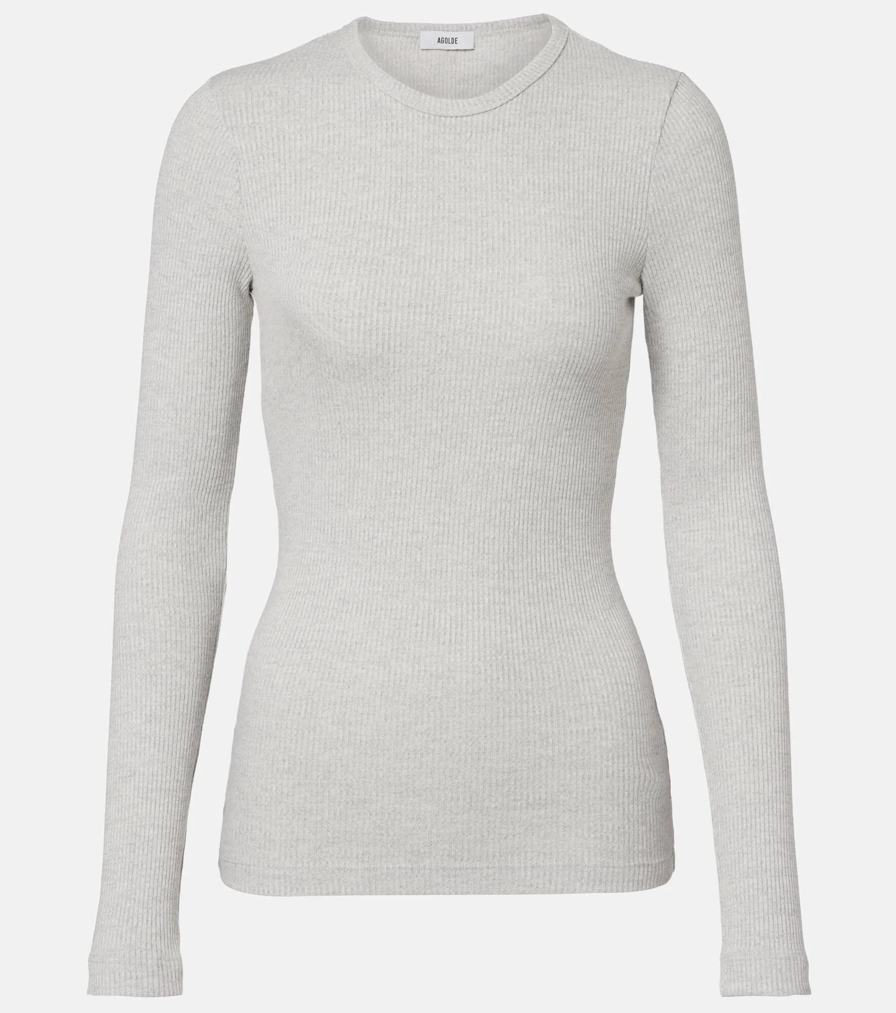 Add the Delphi long-sleeved top from Agolde to your everyday collection. Primed for layering, the ribbed-knit design features a crewneck and comes in a fitted silhouette. Product Details - Material: 46% polyester, 32% cotton, 18% rayon, 4% elastane - Care instructions: hand wash - Made in the USA - Designer color name: Brushed Grey Heather - Item color: gray - Cuff: ribbed - Hem: ribbed - Item number: P01115490 Size & Fit - True to size - Fitted - Stretchy fabric - Falls to the hip - The model seen in the picture is 178cm-5'10" and wearing a size XS