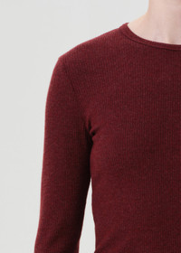 The Delphi Slim Tee is a fitted long sleeve crewneck with a flattering ribbed texture. Crafted from midweight fabric, it offers a sleek, streamlined fit ideal for layering or wearing solo. Looks Like: Rich dark red fitted long sleeve crewneck tee Feels Like: Midweight intermingle chunky rib that hugs the body MORE DETAILS Body Length: 25" Chest: 27" Shoulder to Shoulder: 13" Sleeve Length: 25" Model is 5'10" and wearing a size Small Fabric: 50% Polyester, 32% Cotton, 18% Rayon Care Instructions: Machine wash cold. Made in USA with imported materials A7230-1352-BIK