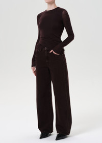 The Eve Twist Tee is a long sleeve crewneck with subtle front twist detailing at the hem for a softly draped effect. Form-fitting and flexible with a refined feel. Style it with high-rise denim or layered under jackets for a sleek, everyday base. This fit is true to size. Looks Like: Dark brown and burgundy long sleeve crewneck tee with front twist detailing at the hem line Feels Like: Ultra-soft, lightweight fine needle baby rib MORE DETAILS Body Length: 25 1/2" Chest: 28 1/2" Sweep: 28" Shoulder to Shoulder: 13 3/4" Model is 5'10" and wearing a size Small Fabric: 94% Lyocell, 6% Spandex Care Instructions: Machine wash cold. Made in USA with imported materials A7394-1618-ROTO